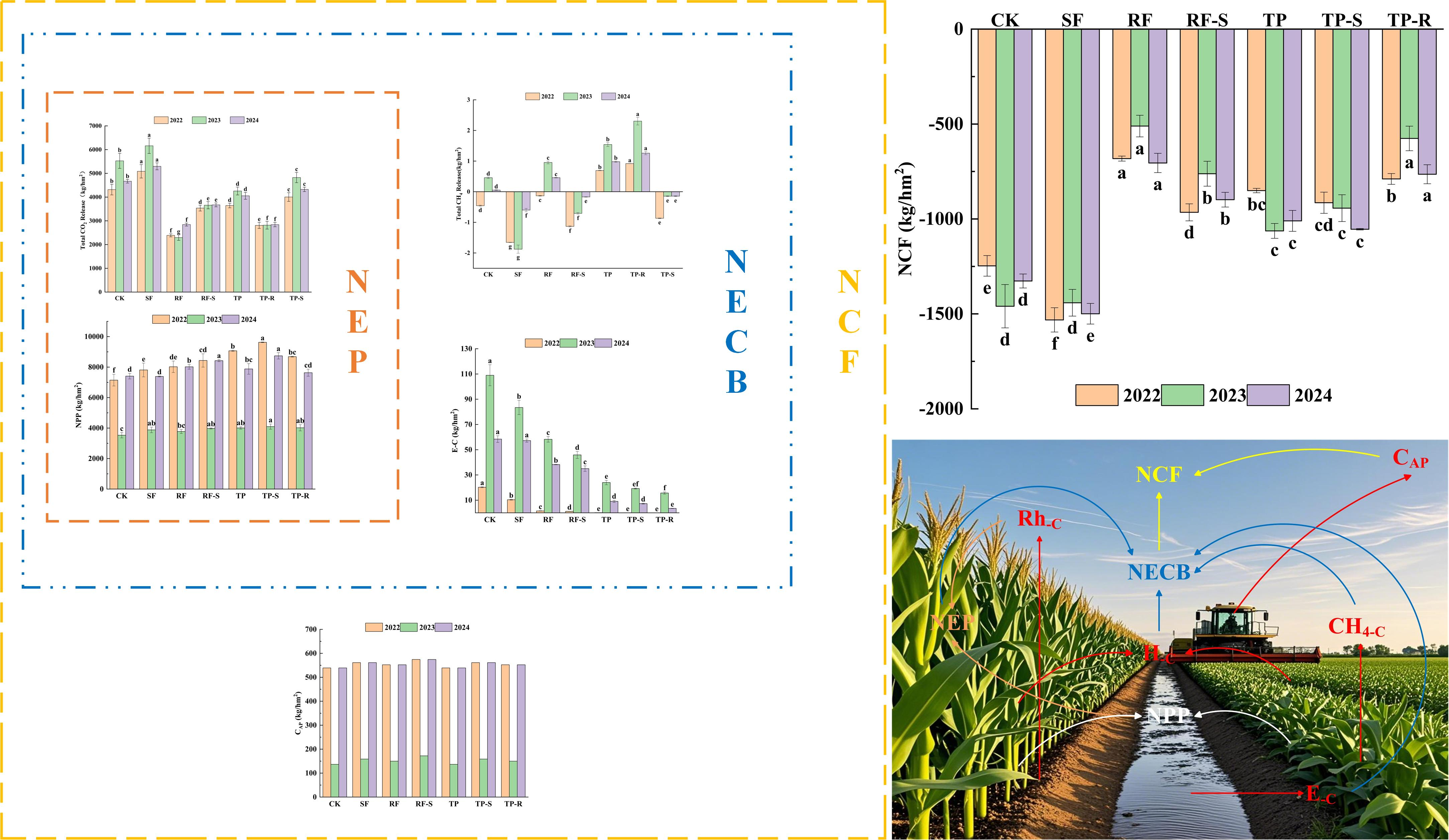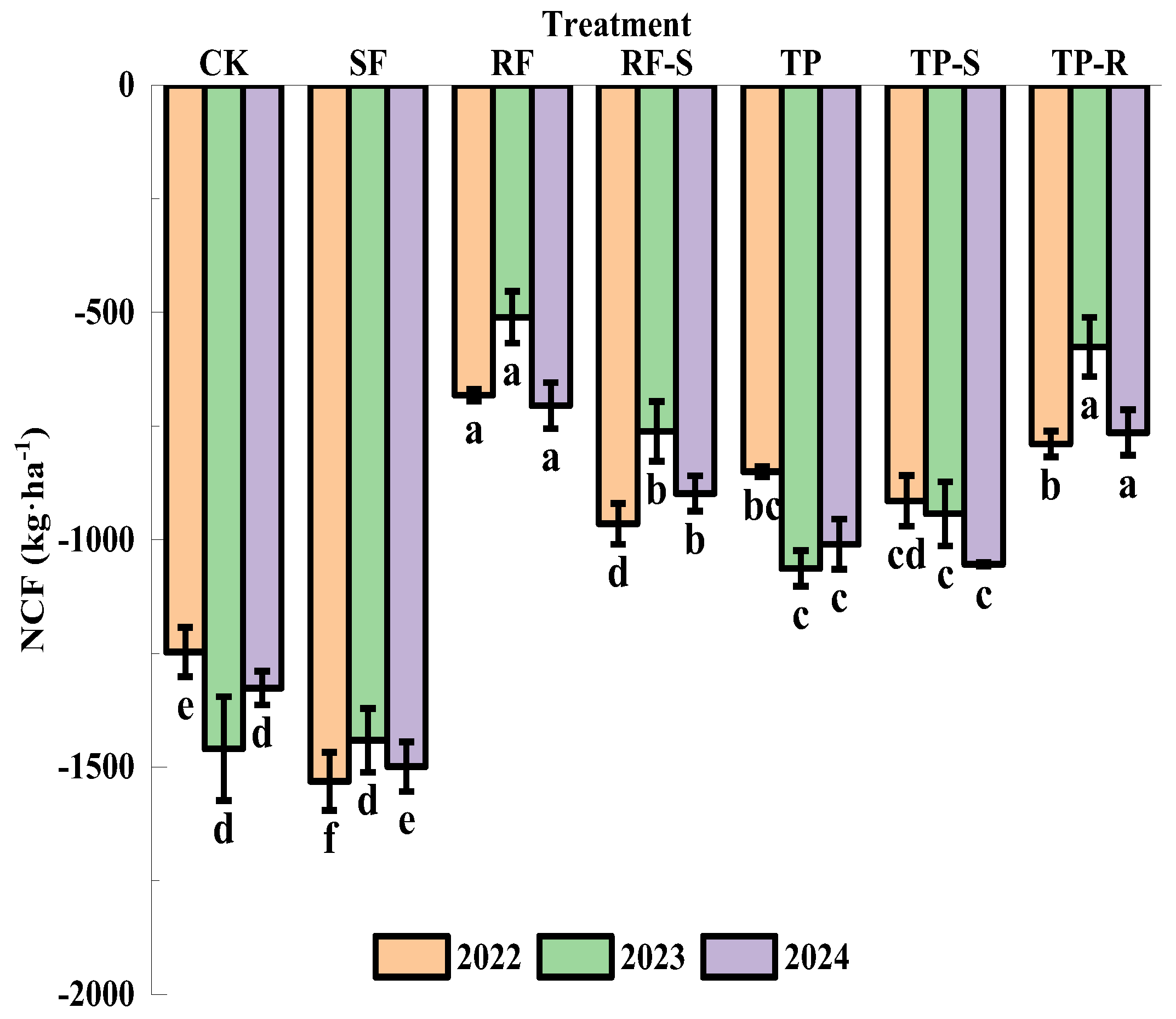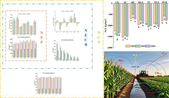 3.4. Net Carbon Balance (NCF) of Cropland System Under Different Tillage Measures