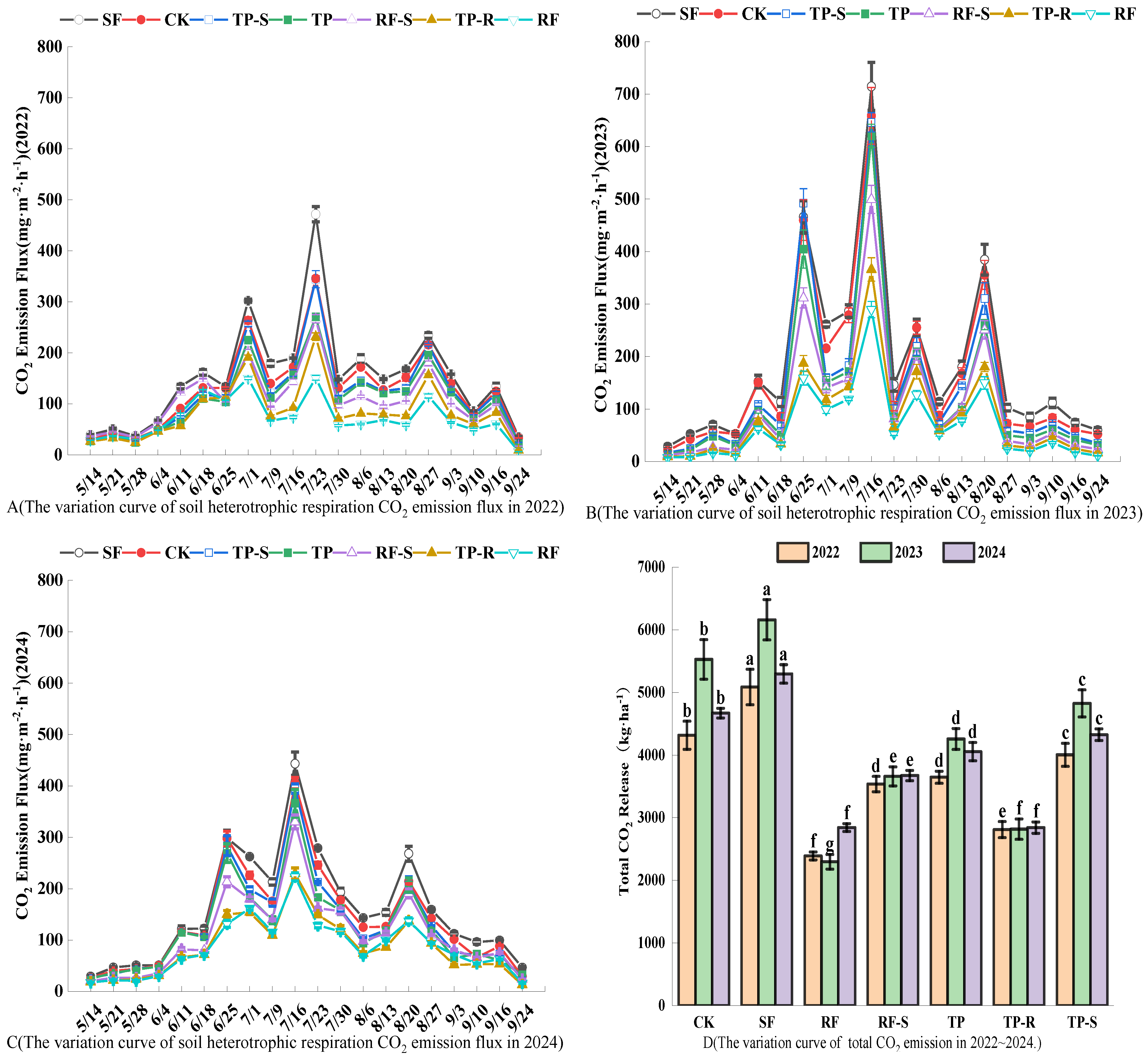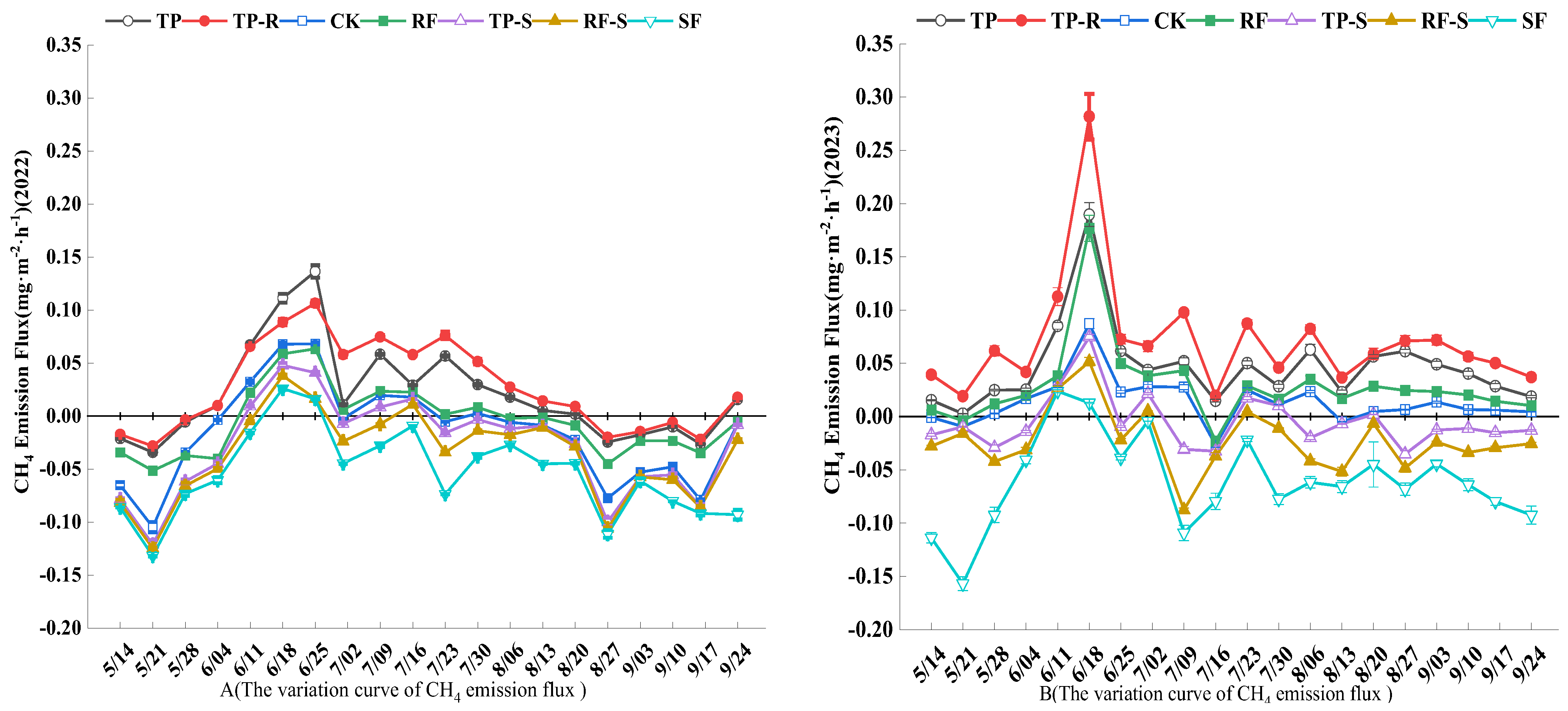 3.1. Soil Heterotrophic Respiration CO2 Emission and CH4 Emission Under Different Tillage Measures