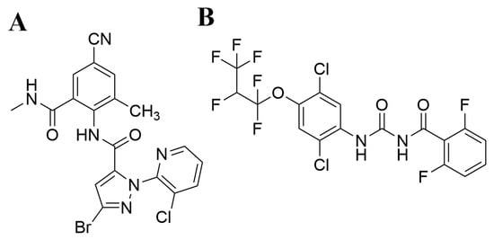 CYA and LUF (Figure 1) have been registered to control the diamondback moth on pak choi. CYA, an anthranilic diamide insecticide, exerts its effect through ryanodine receptor activation, resulting in rapid calcium ion release [8]. LUF, a benzoylurea insect growth regulator, inhibits chitin synthesis in target insects [9]. However, these pesticides pose significant human and ecological safety risks, as confirmed by existing studies. For instance, adverse sub-chronic exposure effects were observed in earthworms and zebrafish exposed to CYA [10,11]. In mammalian studies, CYA can harm the female reproductive system of pubertal and adult offspring [12]. LUF causes severe toxic effects in free-living terrestrial fauna [13]. Additionally, while LUF is used to treat animal parasites and infections in veterinary medicine, recent studies indicate it causes genetic and reproductive harm in pregnant rats [14]. Notably, these compounds have been detected in environmental matrices, vegetables, fruits, and tea, raising significant safety concerns [15,16,17,18,19,20]. The safety of these pesticides has been investigated in tomatoes [21], chili peppers [22], rice [23], and other crops. Nevertheless, comprehensive studies on pak choi remain limited. Moreover, in-depth investigations into dissipation mechanisms and probabilistic risk assessment models are lacking.