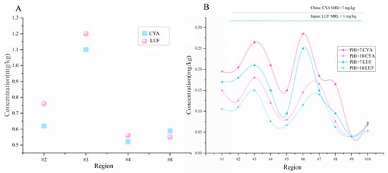 The initial deposition of CYA and LUF in pak choi (A), and terminal levels of eCYA and LUF in pak choi with PHI of 7 d and 10 d (B).