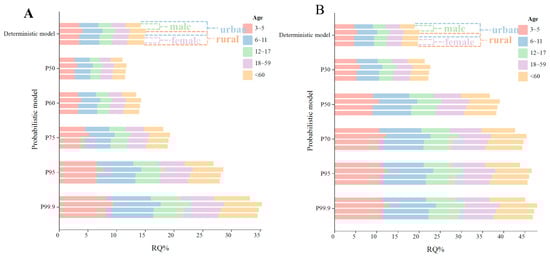 Long-term dietary risk of CYA (A) and LUF (B) in pak choi by deterministic and probabilistic models for people of different ages, genders, and regions.