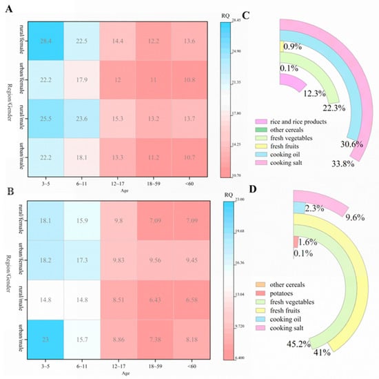 Furthermore, the health risks associated with consumption of multiple foods were much greater than those associated with single dietary crops. Therefore, the total chronic dietary risk of CYA and LUF in all registered crops in China was assessed. Following the risk maximization principle, the Maximum Residue Limit (MRL) value of registered crops was selected for assessment. The dietary classification and MRL summary of registered crops are summarized in Table 5. The deterministic assessment method was employed for evaluation. The total % RQs of all registered crops ranged from 10.7% to 28.4% for CYA (Figure 4A) and from 6.43% to 23.0% for LUF (Figure 4B). A clear decreasing trend in risk was observed from children to adults (p < 0.05). The 3–5 years age group exhibited the highest risk for CYA and LUF, with risk quotients of 22.2–28.4% and 18.1–23.0%, respectively. This elevated risk was primarily attributed to higher per-unit body weight intake and greater sensitivity to contaminants in children. Indeed, the same phenomenon has been observed in many studies: procymidone in Chinese leek, cowpea and celery poses the greatest risk to children aged 2–6 years [47], and 15 common pesticides in chrysanthemum pose the highest dietary risk to children aged 2–3 years [48]. Regarding CYA, dietary risks in rural areas were generally higher than those in urban areas. Cooking salt and cooking oil contributed 64.4% of the total NEDI (Figure 4C), with higher consumption of salt and oil observed in rural areas compared to urban areas. In contrast, urban areas demonstrated elevated LUF risks relative to rural areas due to higher fruit and vegetable consumption, which accounted for 86.2% of the total NEDI (Figure 4D). The risk levels are closely related to the dietary habits of these populations [49]. Collectively, CYA and LUF exhibited acceptable exposure risks in their registered crops.