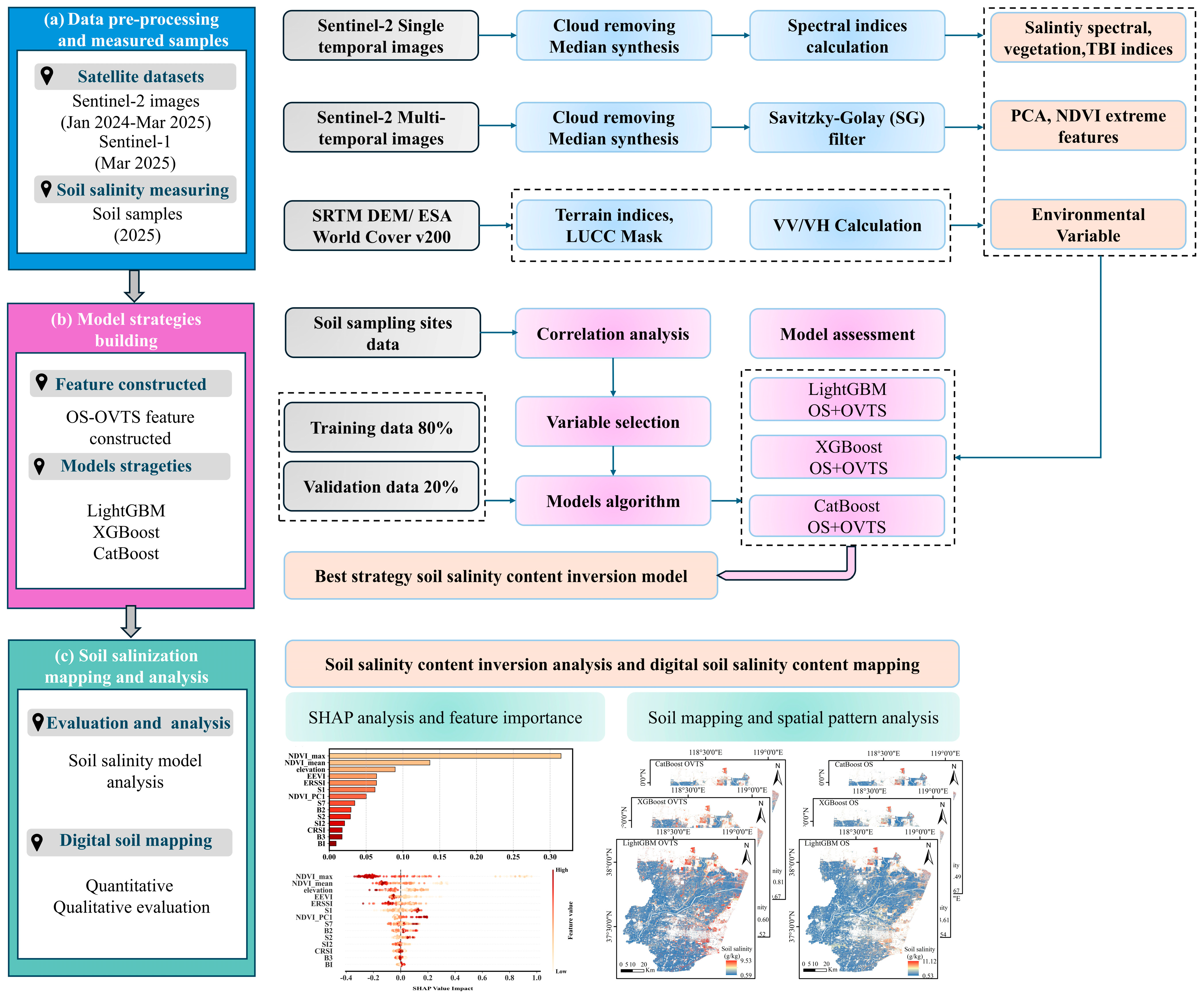 - Shi, S.; Wang, N.; Chen, S.; Hu, B.; Peng, J.; Shi, Z. Digital mapping of soil salinity with time-windows features optimization and ensemble learning model. Ecol. Inform. 2025, 85, 102982. [Google Scholar] [CrossRef]