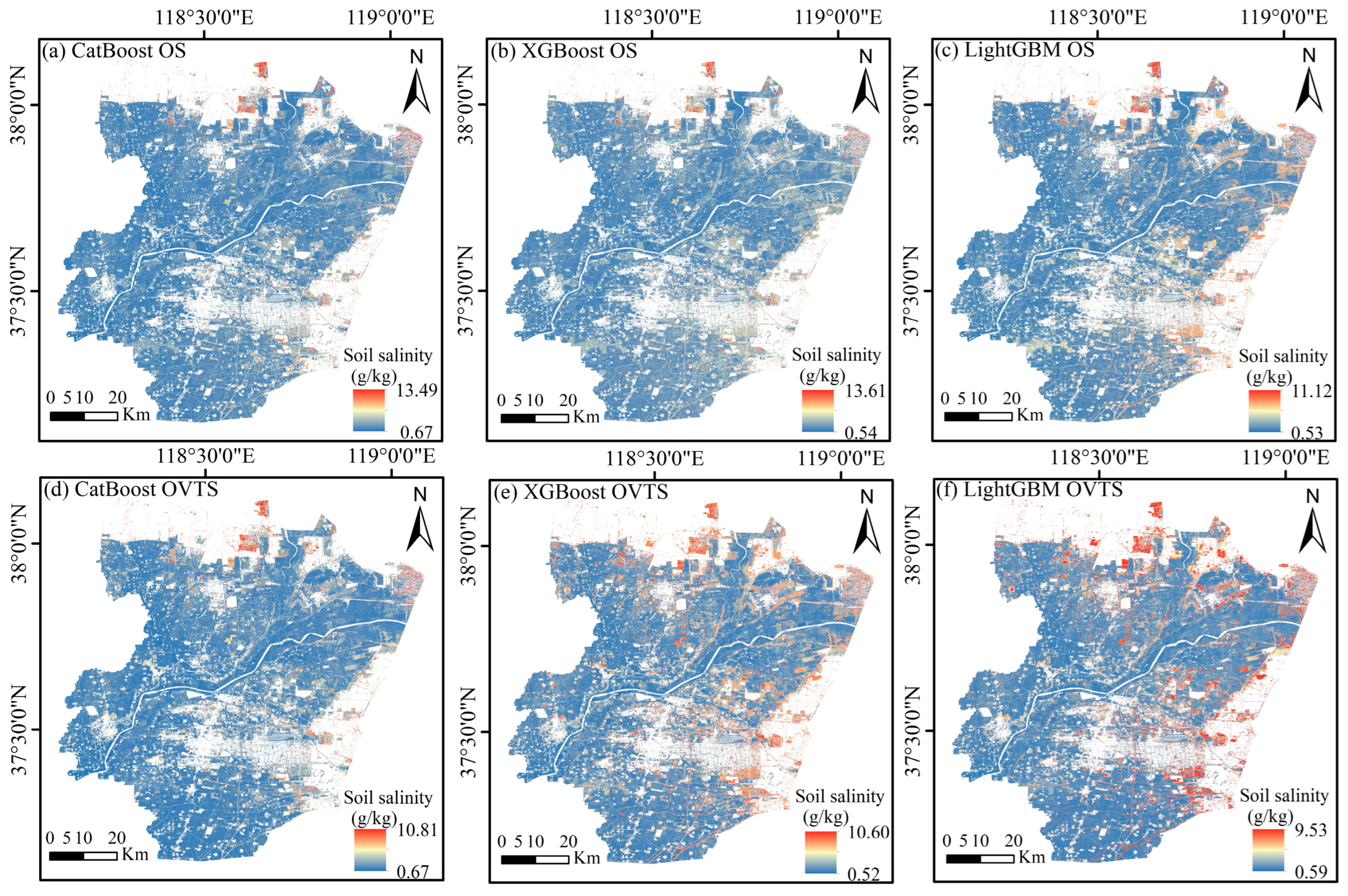 - The LightGBM model integrating spectral and vegetation temporal features within the OVTS framework significantly enhanced the spatial coherence of salinity gradients and effectively improved spatial refinement capabilities. It achieved optimal validation accuracy (R2 = 0.77, RMSE = 0.26 g/kg), with a 13% increase in R2 and a 27.7% reduction in RMSE compared to spectral only models.