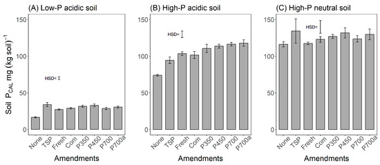 In the two acidic soils, the concentrations of plant available PCAL were significantly increased by the amendments (Figure 1). Higher P availability is in agreement with findings for soils amended with biochars [21,46,47,60,75], compost [42] and fermentation residues [43]. The amendment-induced increase in the soil PCAL concentration (API) was significantly influenced by the soil and the treatment method for green waste (Figure S3 and Figure 3). The API was much larger in the high-P acidic soil than in the low-P acidic soil and the high-P neutral soil. This was possibly due to lower saturation of soil sites, which strongly bind PCAL in the low-P acidic soil, and lower capacity for P sorption in the high-P neutral soil [76,77]. The API may be due to the direct supply of PCAL with the amendments and/or amendment effects on soil P dynamics. In the high-P acidic soil, the amount of amendment-induced PCAL increase (in mg PCAL/100 g soil) for all amendments was substantially higher than the amount of PCAL supply with the amendments, whereas, in the low-P acidic soil and the high-P neutral soil, the amendment-induced PCAL increase was similar to or lower than the PCAL supply (Table S4). This indicates that, in the high-P acidic soil, the amendments led to a transfer of soil P into the plant available PCAL pool. A transfer of soil P into the PCAL pool can be mediated by pH-related mechanisms [48] and mechanisms that act independently of the pH [42,60].