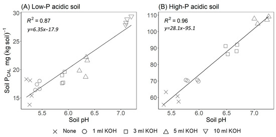 The pH effects on soil PCAL were derived from the treatments, which increased the soil pH by adding KOH (see Section 2.3.1). For both acidic soils, PCAL was closely related to soil pH. The relationships differed between the soils: