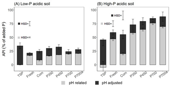 In our study, the soil pH without fertilization was 5.3 in the low-P and 5.6 in the high-P acidic soil. The fertilization with organic amendments increased soil pH, whereby the pH increase was significantly influenced by the method of green waste treatment (Table 4 and Table S1). The amendment-induced pH increase was lowest with compost, higher with fresh GW and largest with biochars. For biochar-amended soil, the pH increased with increasing pyrolysis temperature. The amendment-induced increase in soil pH is in agreement with findings for composts [25,78] and biochars [60,75,79]. It was found in many studies that the effect of organic amendments on P availability is dependent on soil pH [70,80]. The pH-related increase in the soil PCAL concentration (APIpHrel.) varied between 36% of API for compost amended soil, about 50% of API in soils amended with P350 or P450 and about 80% of API for the soils amended with fresh green waste, P700 or P700a (Figure 3). Conversely, this means that the compost effect on the PCAL concentration was mainly due to pH-independent mechanisms, while only 20% of the effect of fresh green waste and biochar produced at 700 °C was pH-independent. It is expected that the pH-dependent effects of organic amendments on soil P availability will be most important on acidic soils, while the pH-adjusted effects should also be relevant on neutral soils. This is ddsdsdin agreement with the finding in other studies that biochars increase P availability mainly in acidic soils [81,82].