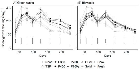 Effect of the fertilizer variant on shoot growth rate of ryegrass: (A) organic amendments derived from green waste, (B) organic amendments derived from biowaste; means ± standard deviation, n = 5. Vertical lines show HSD values for p ≤ 0.05.