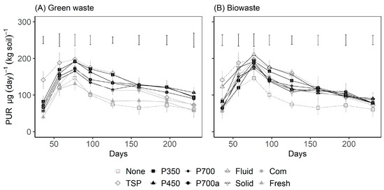 The PURs for compost and the two biochars produced at 700 °C were in between. For the organic amendments derived from BW, the PURs were influenced by the mode of treatment mainly in the initial growth periods, whereas in the last three growth periods the mode of treatment had no significant effect on the PUR. In the first five growth periods, the PURs were highest for FRfluid.