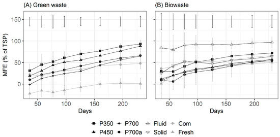 Time course of the mineral fertilizer equivalents (MFEs) for fertilizer variants: (A) organic amendments derived from green waste; (B) organic amendments derived from biowaste; means ± standard deviation, n = 5. Vertical lines show HSD values for p ≤ 0.05.