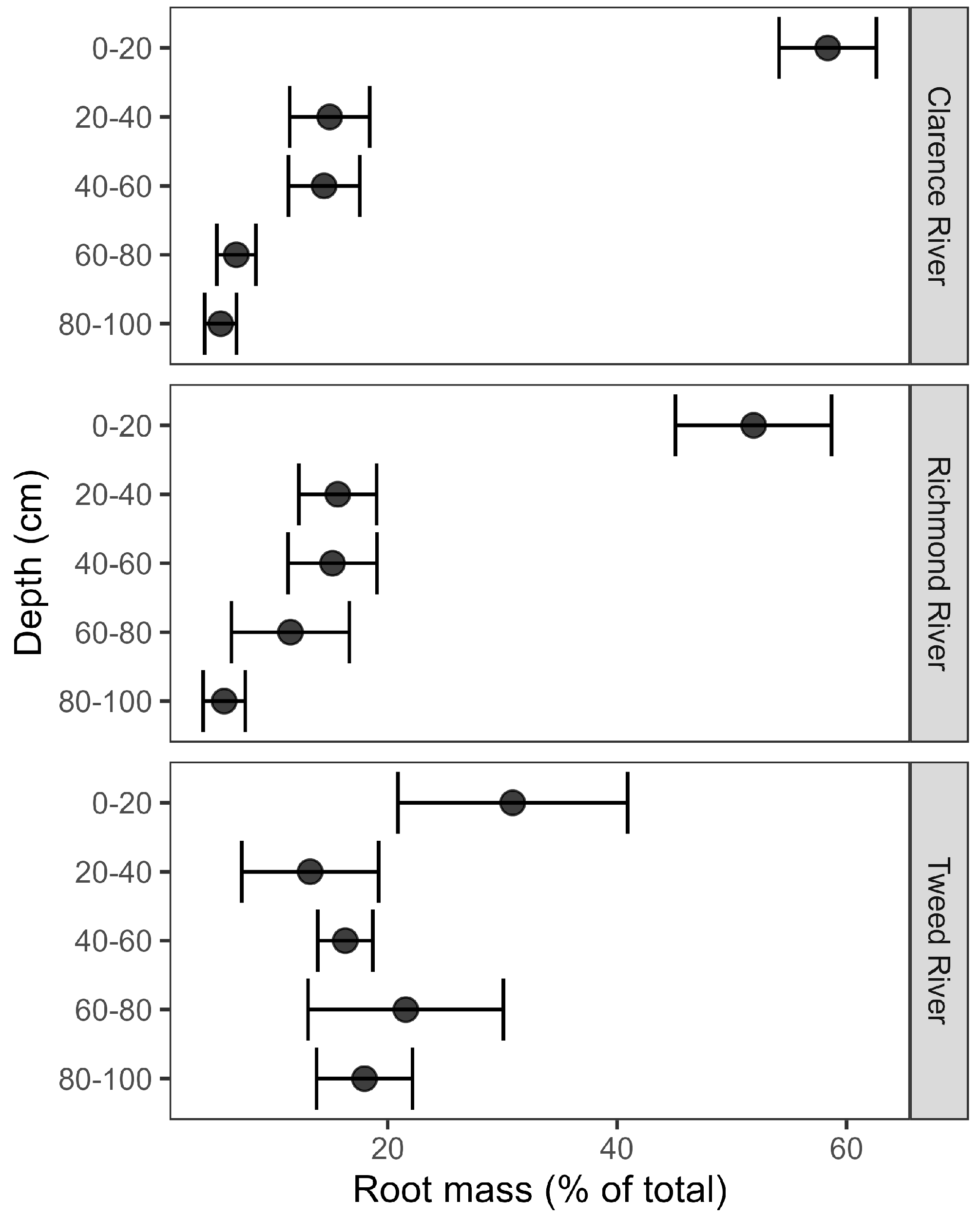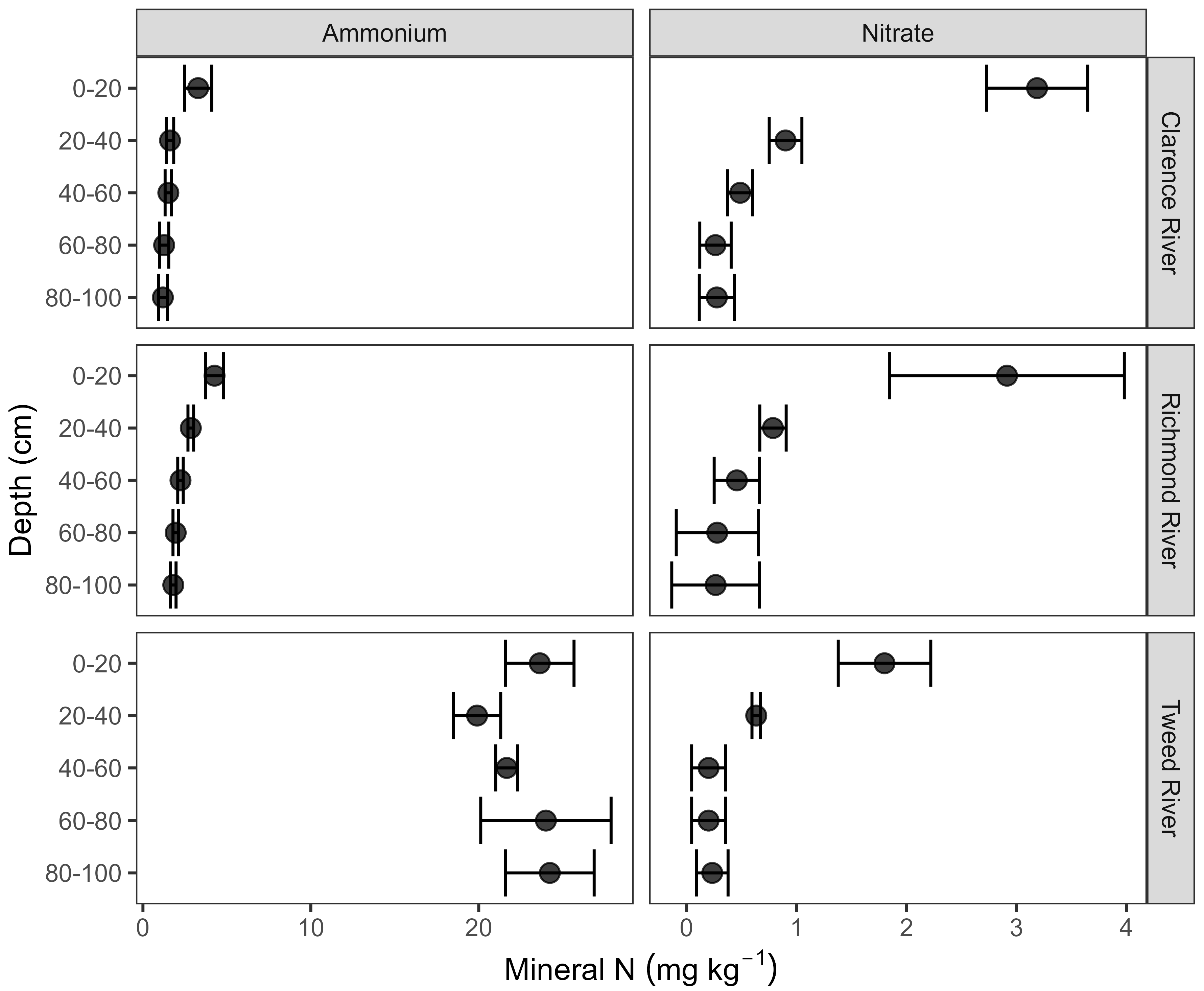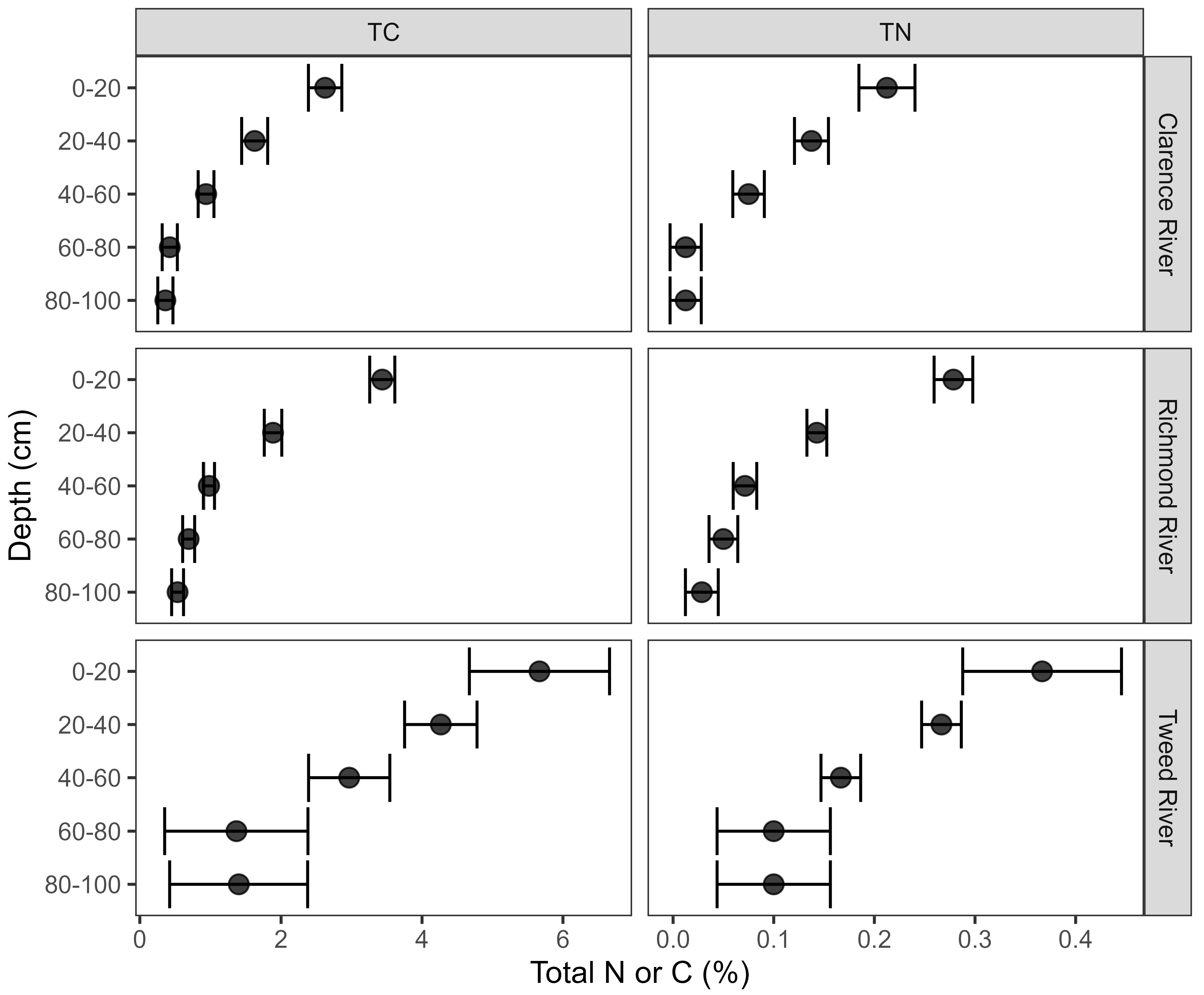 3.1. Soil pH and Concentrations of Total C, Total N and Mineral N Throughout Soil Profiles Across the Clarence, Richmond and Tweed River Catchments