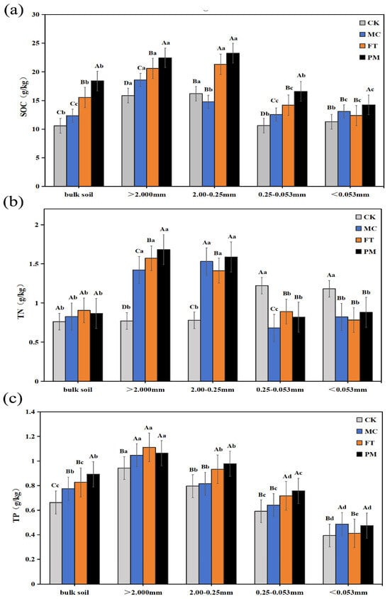 Contents of SOC (a), TN (b), and TP (c) in soil aggregates under different treatments. Note: Uppercase letters denote significant differences (p < 0.05) between treatments for the same aggregate fraction; lowercase letters denote significant differences (p < 0.05) between aggregate fractions within the same treatment.