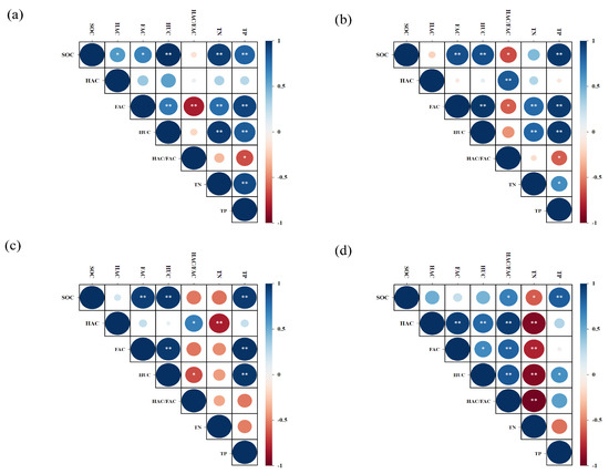 Relationships among various parameters (SOC, HAC, FAC, HUC, HAC/FAC, TN, and TP) across aggregate size fractions were analyzed using the Pearson correlation (Figure 3). The analysis indicated that HAC, FAC, HUC, TN, and TP were positively correlated with SOC content within >2 mm aggregates (p < 0.05). Additionally, SOC showed a significant positive correlation with FAC, HUC, and TP in both the 2–0.25 mm and 0.25–0.053 mm fractions (p < 0.05). Notably, within the <0.053 mm fraction, SOC exhibited a positive correlation with TP and a negative correlation with TN.