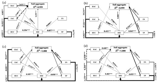 Pathway analysis exploring the direct and indirect effects of SOC, humus carbons, TN and TP on soil aggregate formation. Note: (a), (b), (c), and (d) indicate CK, MC, FT, and PM. R2 is the proportion of variance explained by the corresponding variable in the path analysis. Numbers above the arrows indicate standardized path coefficients. The width of the arrows indicates the strength of the neighboring path coefficients. Solid lines indicate positive correlation, while dashed lines indicate negative correlation. ** and *** indicate significance at the p < 0.05 and p < 0.01 levels, respectively.