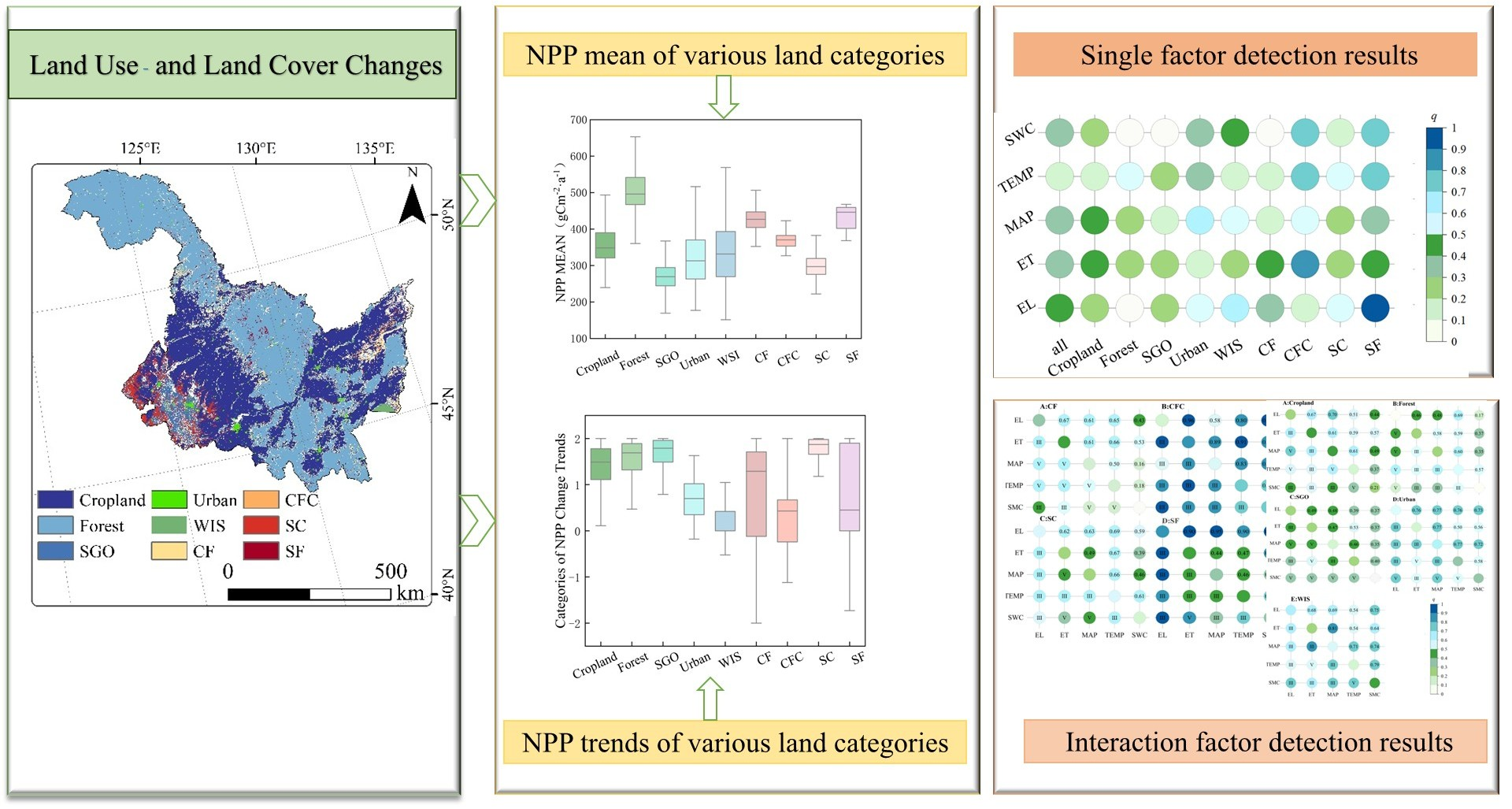 - Among natural factors, mean annual temperature, precipitation, soil water content, evapotranspiration, and elevation all have significant impacts on variations in vegetation NPP. Specifically, the interaction between mean annual precipitation and mean annual temperature exhibits strong explanatory power across multiple land use types, indicating that the synergistic effect of hydrothermal conditions is a key factor driving changes in vegetation productivity. Additionally, elevation often interacts with other factors to jointly influence NPP, highlighting the importance of topography in regulating the functions of regional ecosystems.