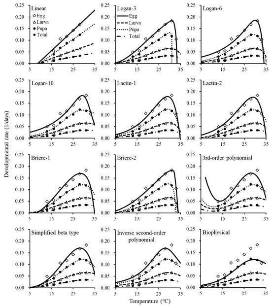 To select the most suitable model for describing the temperature-dependent developmental rate of eggs, larvae, pupae, and the entire immature stage, the following comparison criteria were taken into account: