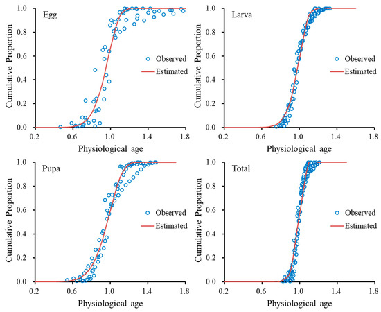 The relationship between the cumulative proportion of developmental completion and physiological age for eggs, larvae, pupae, and total immature stage was effectively modeled using a two-parameter Weibull function (Egg: F = 966.28; df = 1, 69; p < 0.0001; Larva: F = 3664.01; df = 1, 86; p < 0.0001; Pupa: F = 2652.01; df = 1, 83; p < 0.0001; Total immature: F = 3891.84; df = 1, 106; p < 0.0001; Figure 2; Table 5). The distribution patterns for all stages were similar (Figure 2). The parameter a, representing the expected physiological age at 50% developmental completion, was estimated as 0.9886, 1.0128, 1.0132, and 1.0088 for eggs, larvae, pupae, and the total immature stage, respectively (Table 5). Notably, the parameter b was lower in the pupal stage compared to the egg and larval stages, indicating greater variability in developmental durations during the pupal stage.