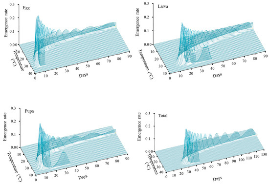 The emergence rate of individuals within a cohort, as a function of cohort age (days) and temperature (°C), was simulated by integrating a nonlinear developmental rate model with stage distribution model, constituting a stage transition model for each developmental stage (Figure 3). Overall, the emergence rate curves across all stages exhibited a similar pattern. At lower temperatures, emergence rates corresponded to prolonged developmental durations accompanied by greater variability. As temperature increased, the curves narrowed and variability decreased, until temperatures exceeded approximately 32.0 °C, beyond which the curves broadened again and displayed a delayed peak emergence time (Figure 3).
