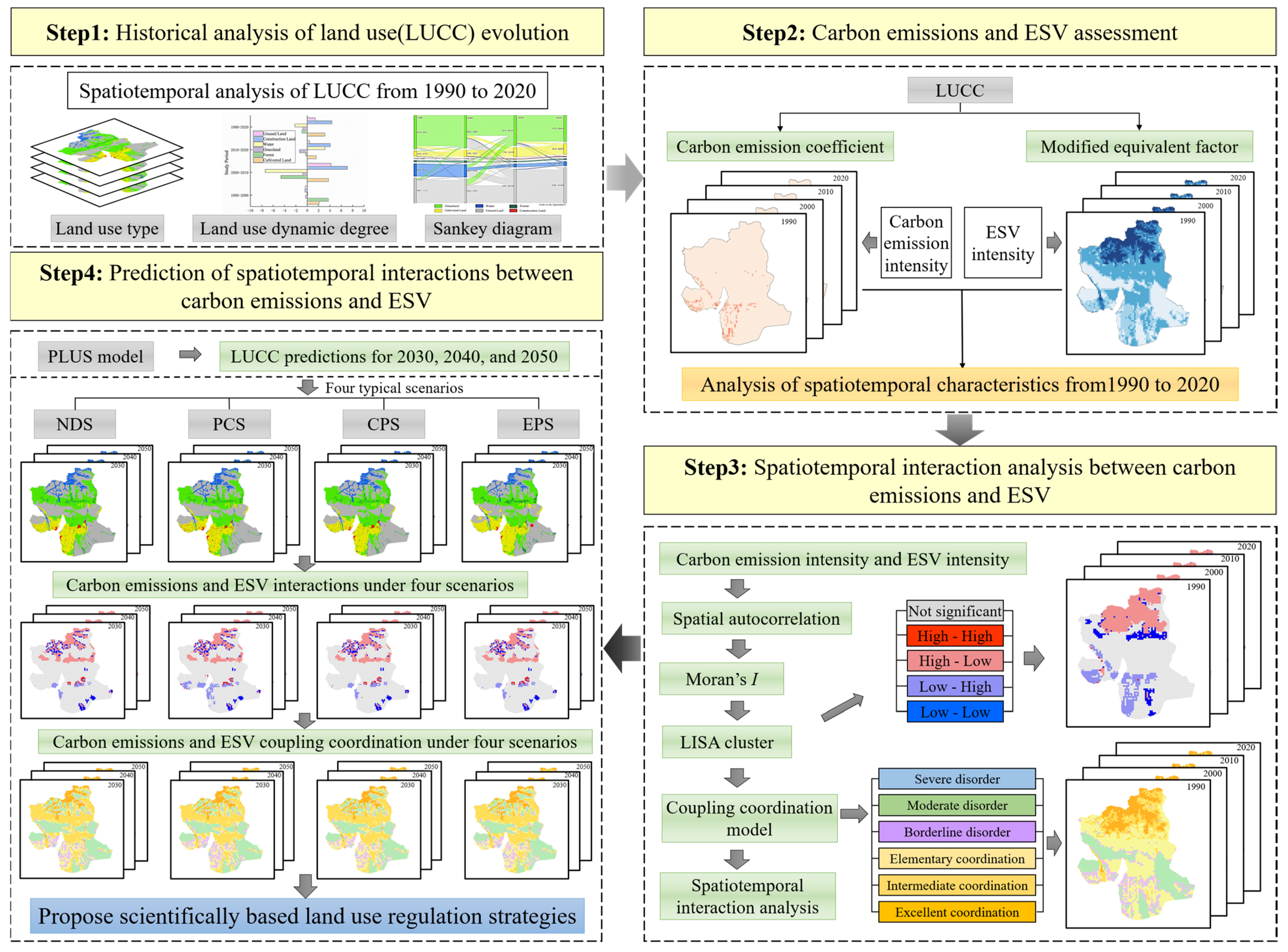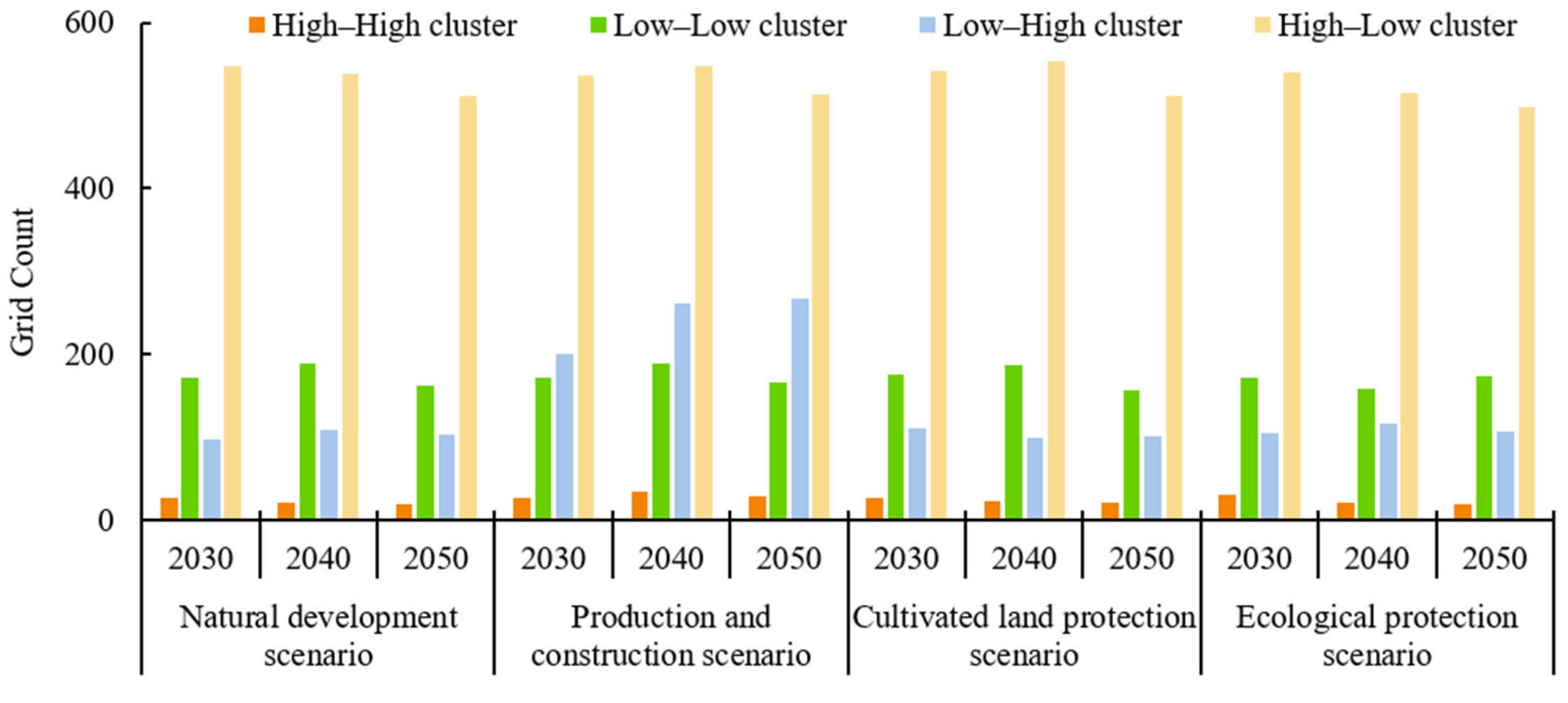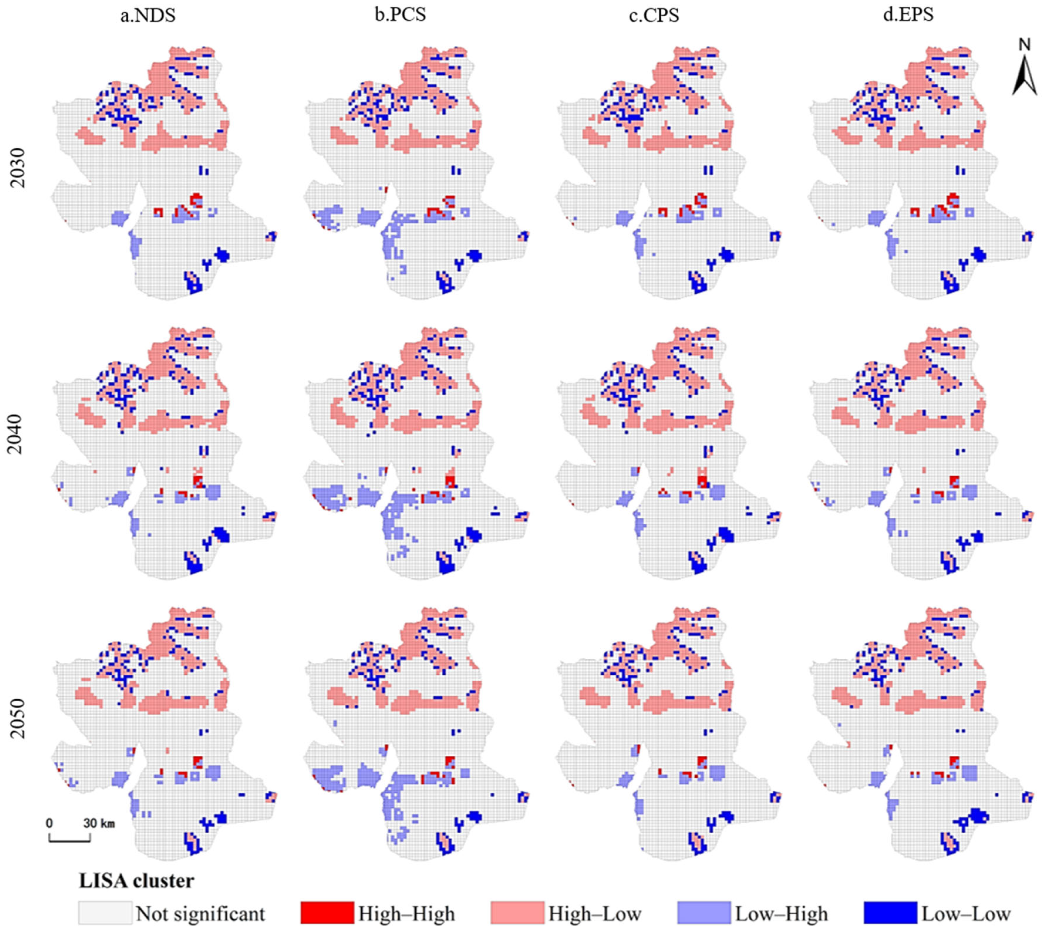 - Based on the spatial clustering of carbon emissions and ESV, and in light of predicted scenario outcomes, we recommend implementing spatially differentiated land use regulation and prioritizing the ecological protection scenario to restore aquatic ecosystems, improve carbon sequestration capacity, and promote synergistic water–carbon benefits.
