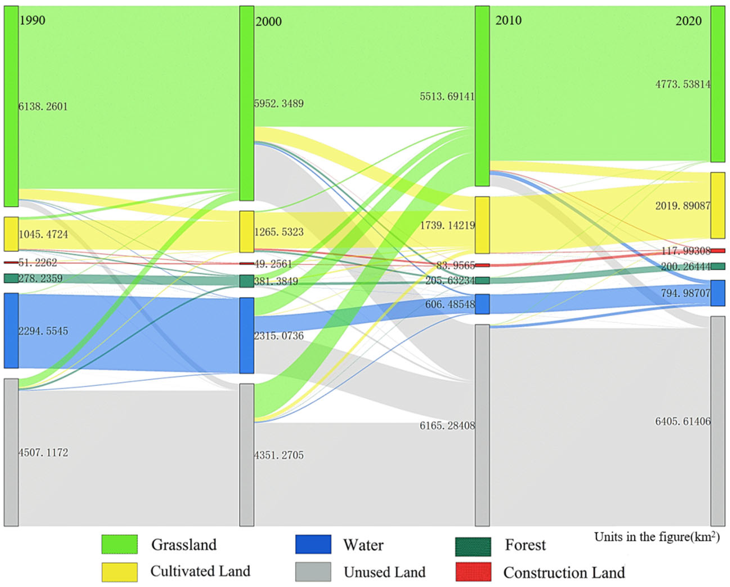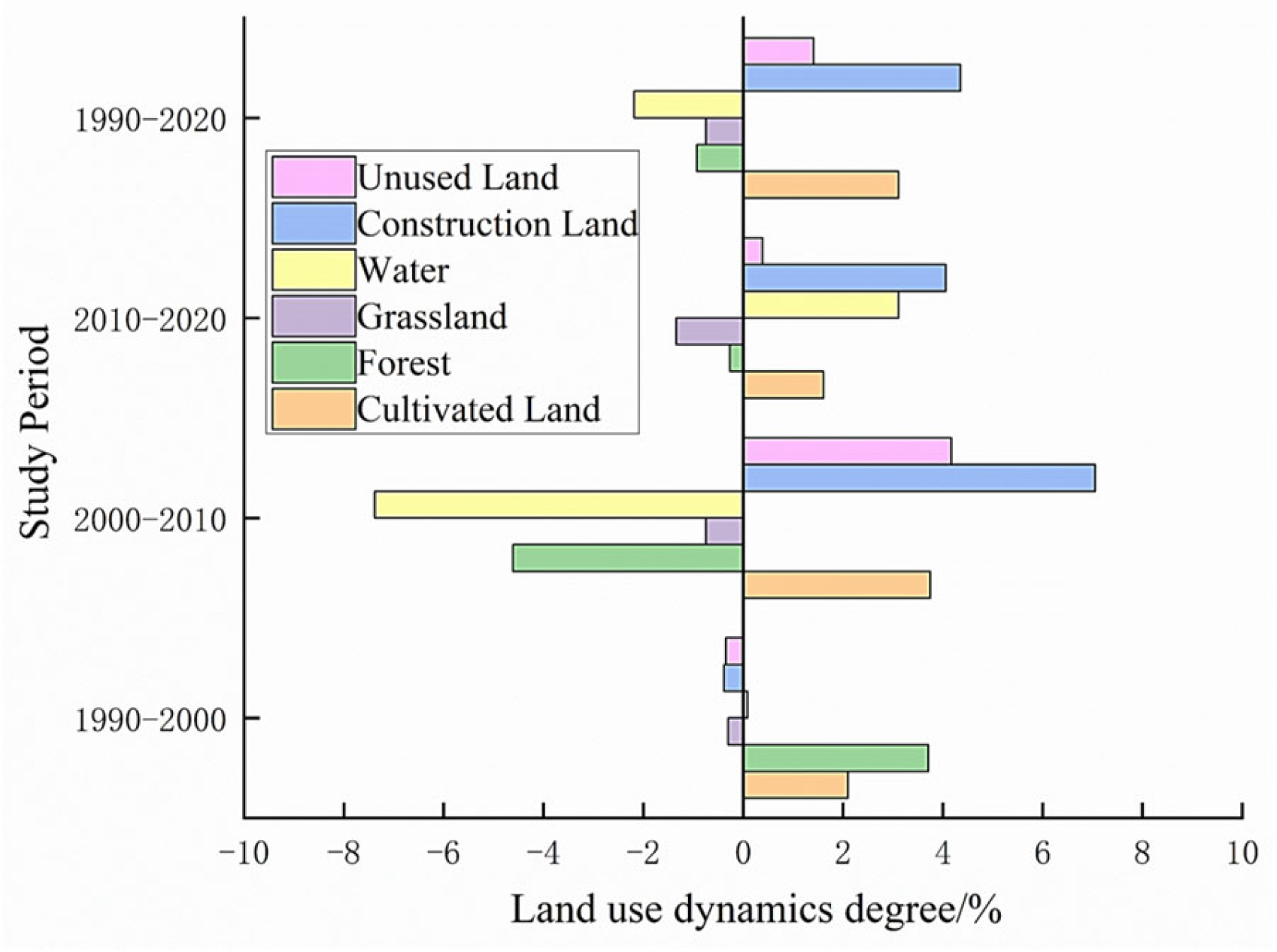 - The Wensu Oasis underwent significant land use/cover change from 1990 to 2020, characterized by the continuous expansion of cultivated land, construction land, and unused land, accompanied by reductions in grassland, forest, and water bodies. The most pronounced changes occurred between 2000 and 2010.