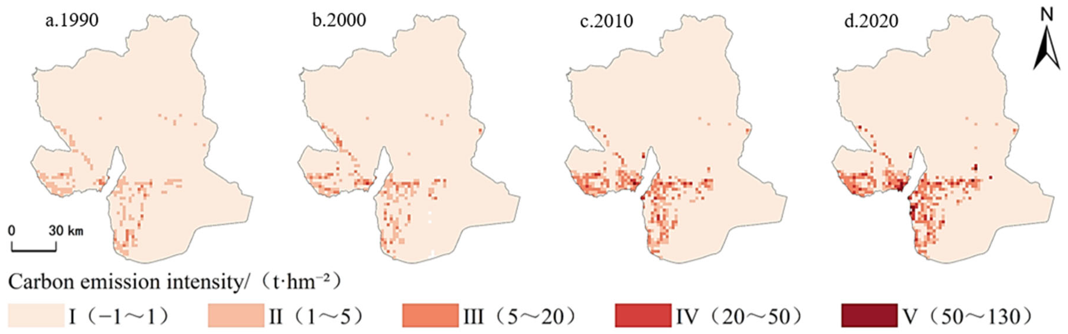 3.2. Spatiotemporal Characteristics of Land Use Carbon Emissions in Wensu Oasis