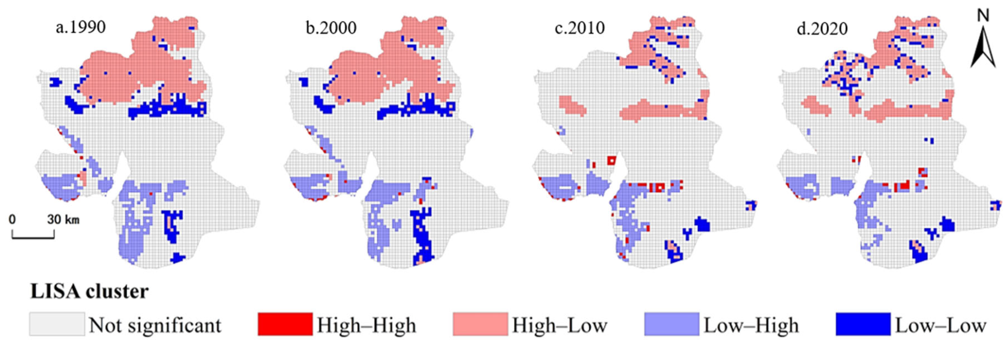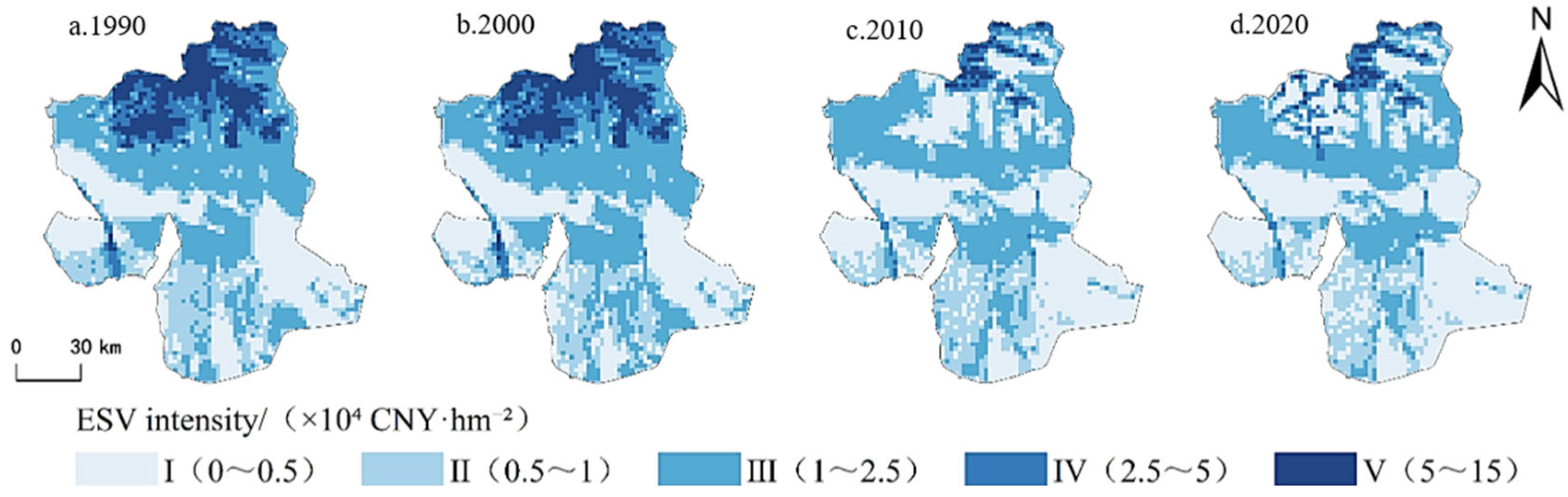 - Carbon emission intensity has increased steadily, with high-value zones expanding in close association with the growth of construction land over the past three decades; conversely, the total ESV has declined by 46.37%, with water and grassland making substantial contributions to the loss. Spatially, carbon emission intensity and ESV exhibit a significant negative correlation, and the coupling coordination degree remains low, following a “high in the north, low in the south” pattern.