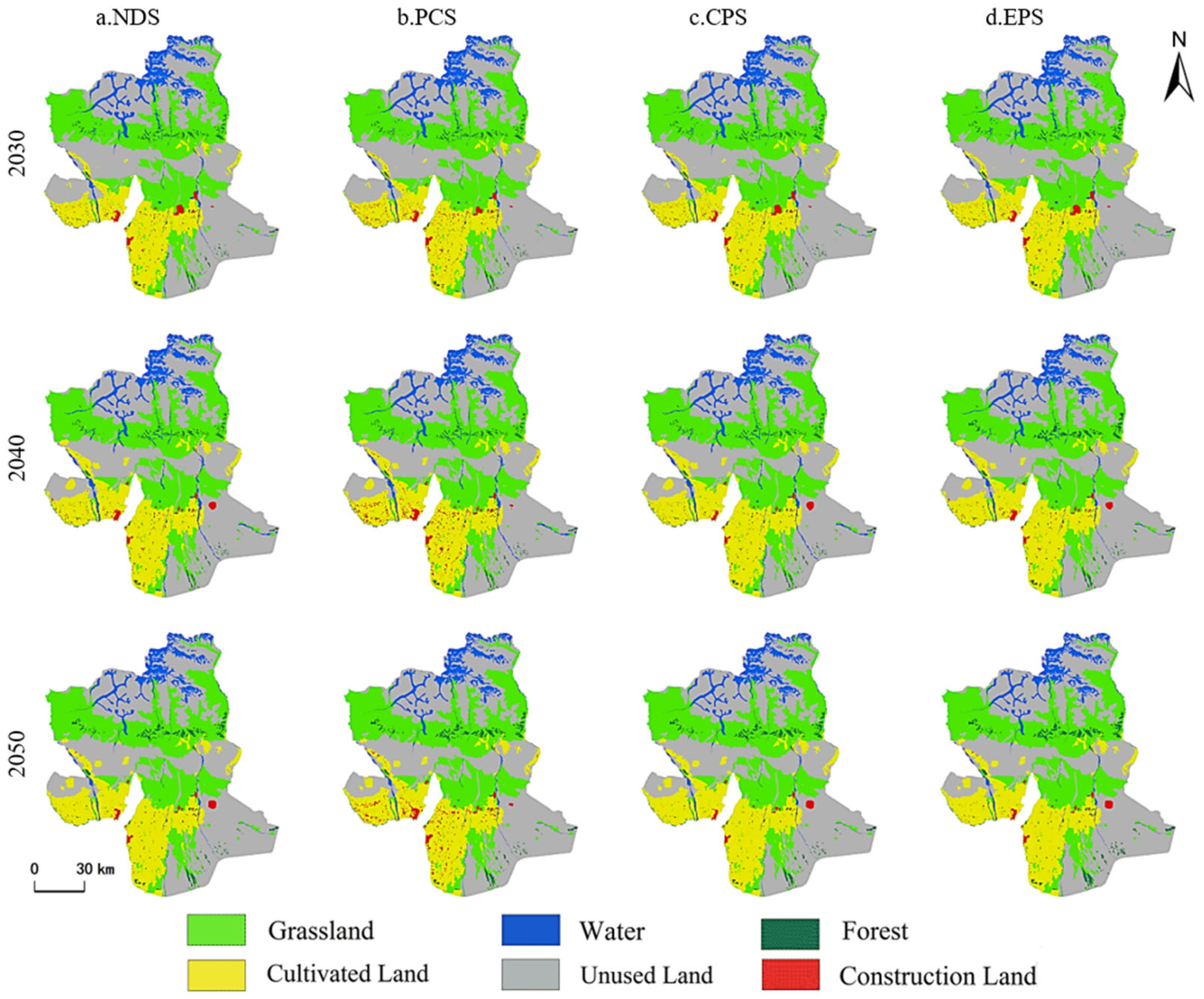 - Ecological protection scenario (EPS) as a priority: converting cropland to wetlands can substantially restore aquatic ecosystem functions and promote synergistic gains in water and carbon regulation. Model simulations indicate that this strategy could enhance regional carbon sequestration by 27.6% and achieve a balance between ecological benefits and agricultural production.
