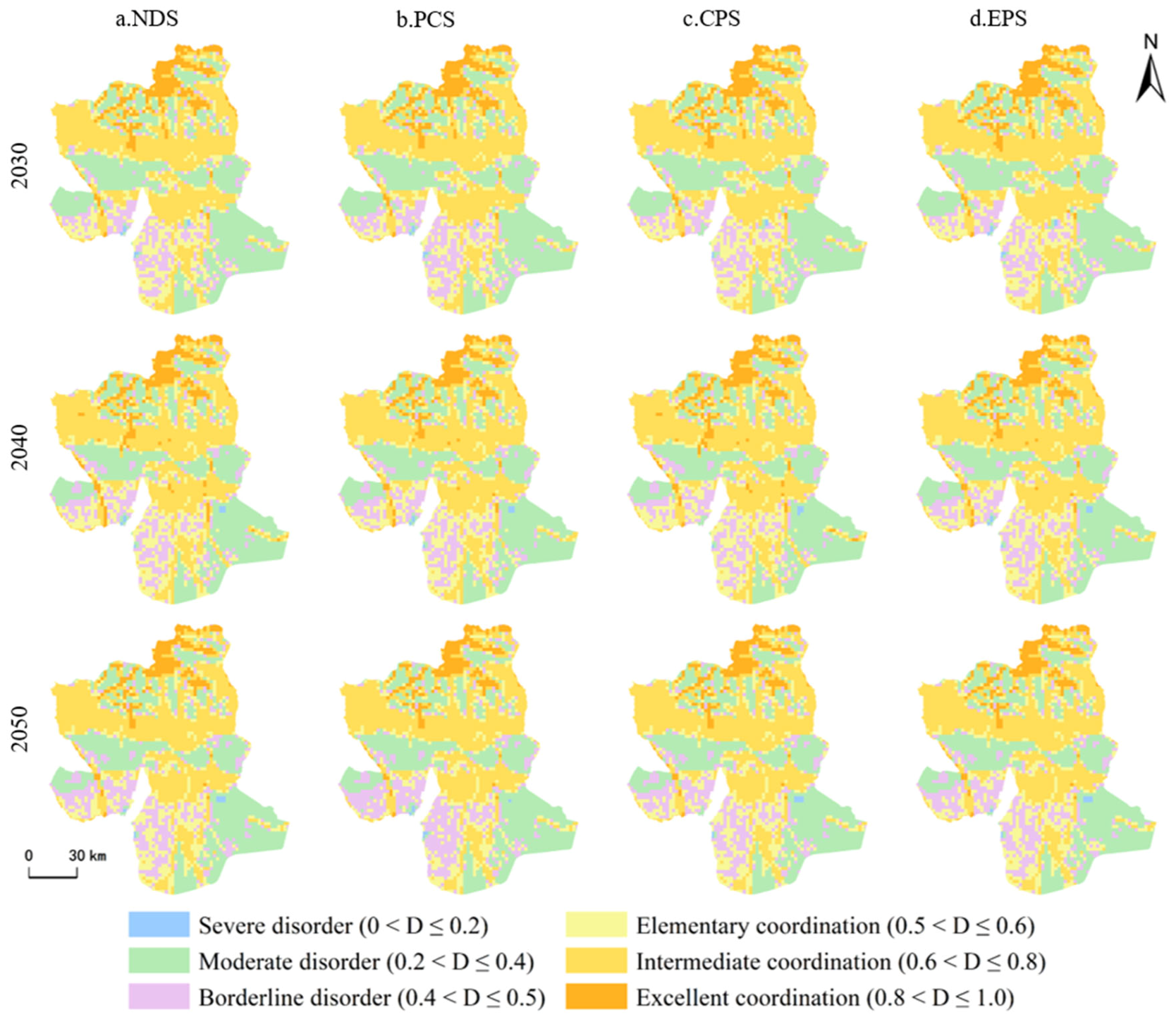 - Under scenarios of natural development, production and construction, cultivated land protection, and ecological protection for 2030, 2040, and 2050, the negative correlation between carbon emissions and ESV is likely to persist. Although the coupling coordination degree remains between 0.52 and 0.54, a slight downward trend is observed, indicating that without targeted interventions, coordinated improvement of carbon mitigation and ESV enhancement will be difficult to achieve.