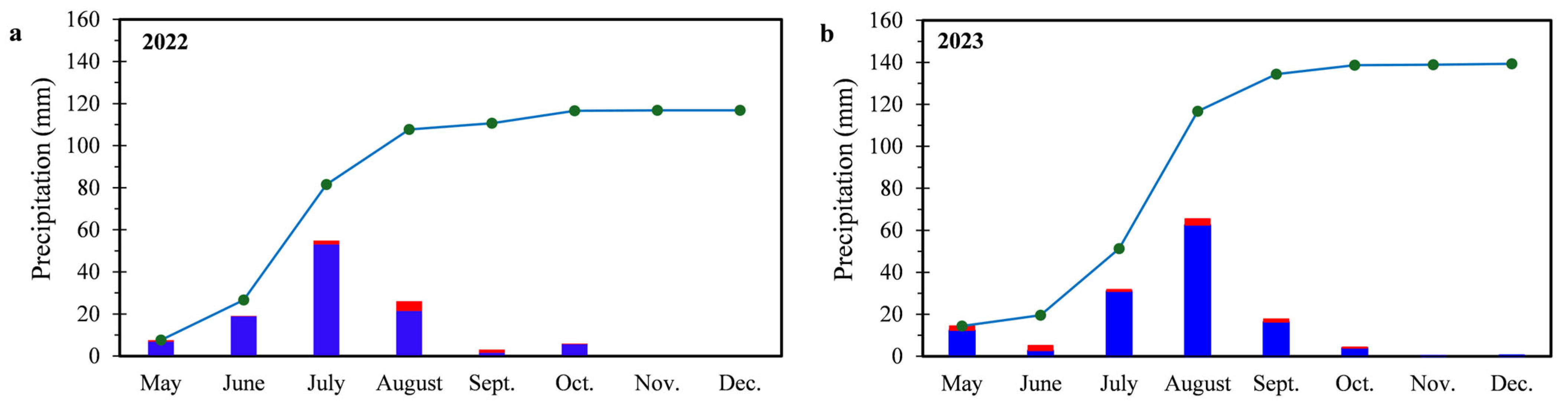 - Ma, B.; Tian, J.C.; He, J.Y.; Wang, Z. The mechanisms of dew formation and its influence on surface soil water content in the Central Ningxia arid belt. Adv. Water Sci. 2022, 33, 955–966. [Google Scholar] [CrossRef]
