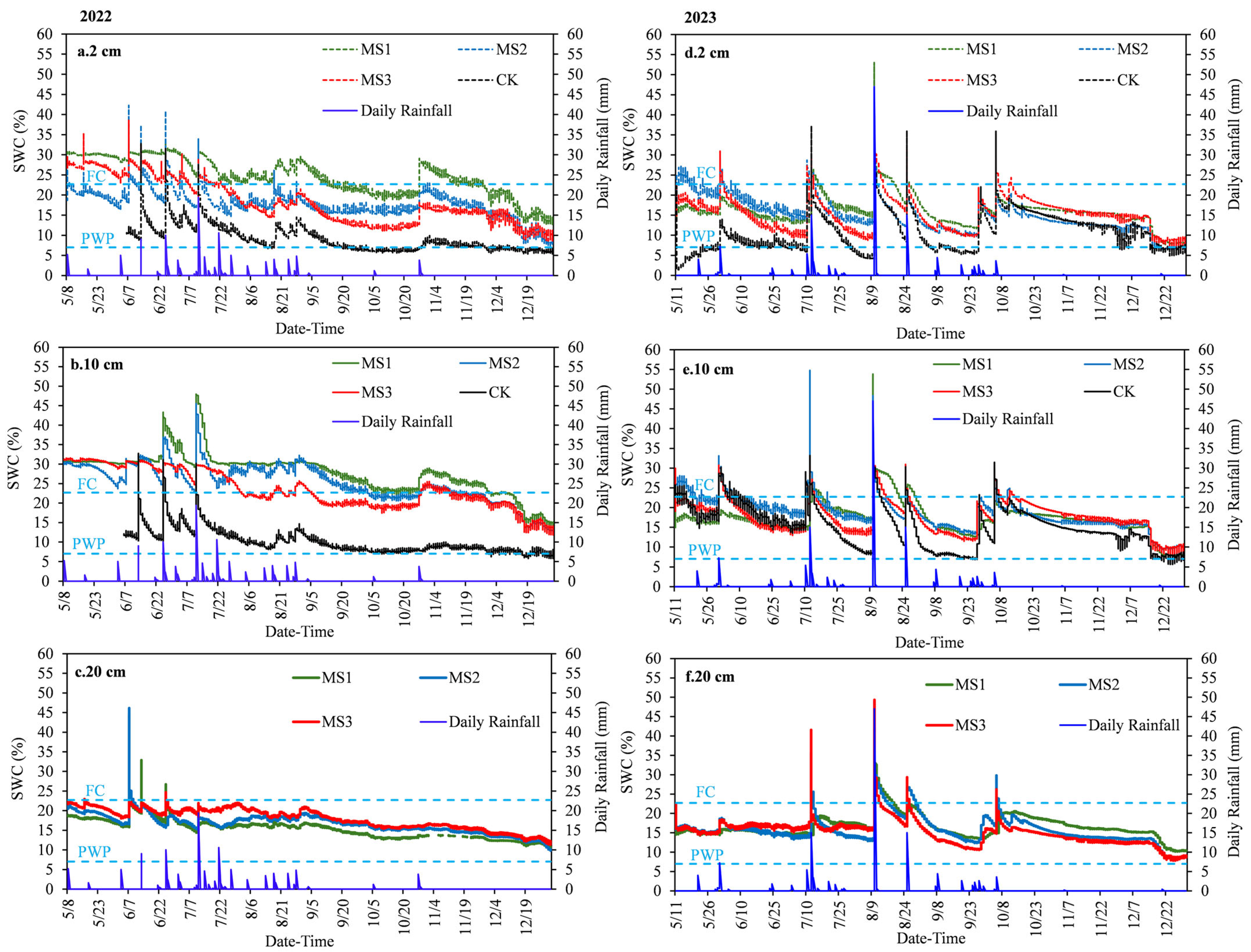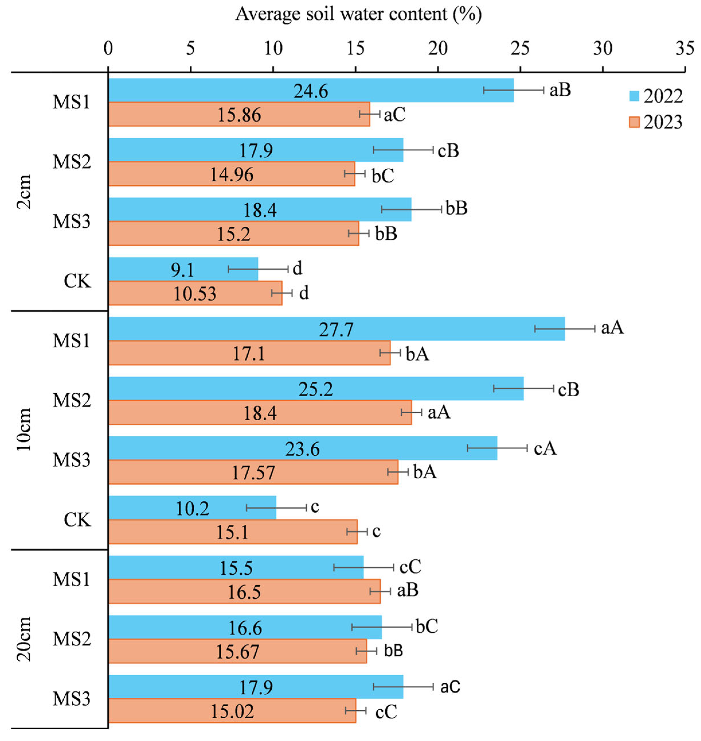 3.3. Effects of Combined Plastic Film and Gravel-Sand Mulching on Soil Water Content