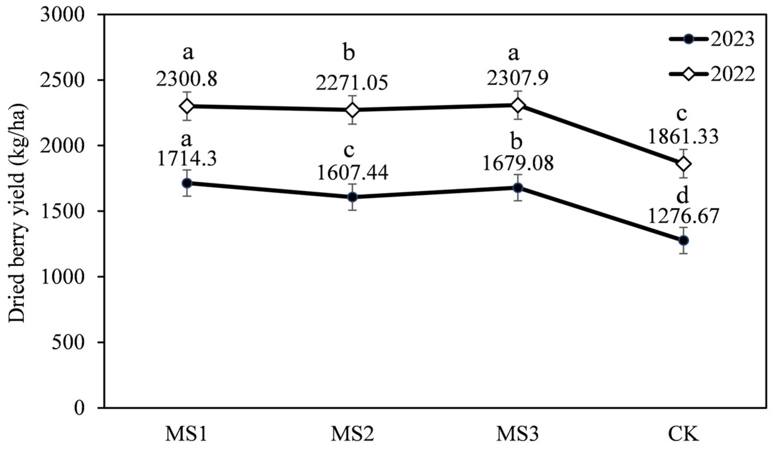 | 2022 | MS1 | 1558.78 ± 1.95a | 5.73 ± 0.04a | 52.25 ± 0.57a | 0.84 ± 0.03a | 0.44 ± 0.08c |