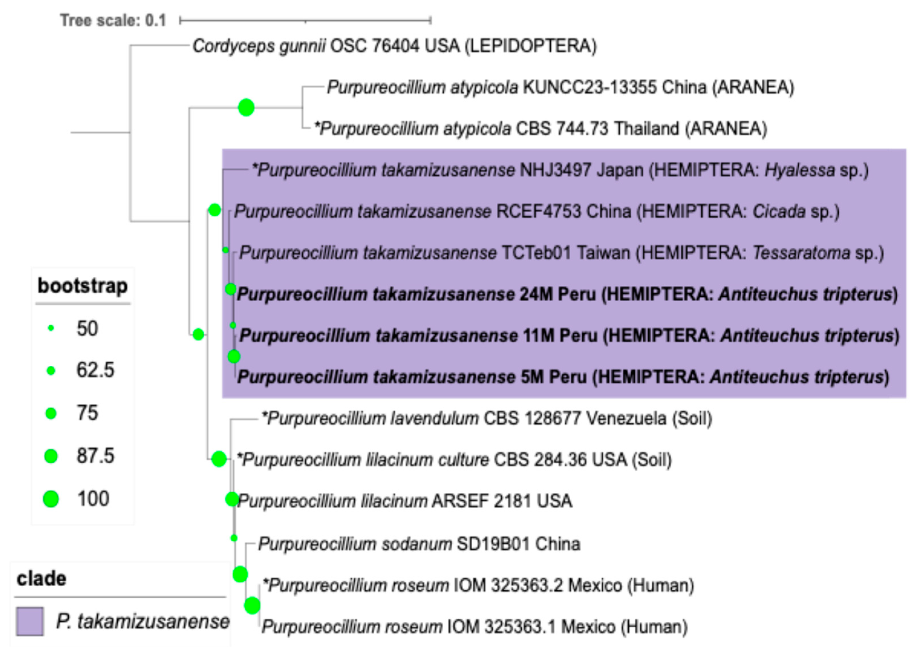 Hernandez-Diaz E, Martínez LC, Díaz-Valderrama JR, Cumpa-Velasquez LM, Oliva-Cruz SM, Huaman-Pilco AF, Rubio K, León-Alcántara EE, Ix-Balam MA. Purpureocillium takamizusanense: A New Entomopathogenic Fungus in the Americas and Its Pathogenicity Against the Cacao Black Bug, Antiteuchus tripterus (Hemiptera: Pentatomidae). Agronomy. 2025; 15(10):2315. https://doi.org/10.3390/agronomy15102315
