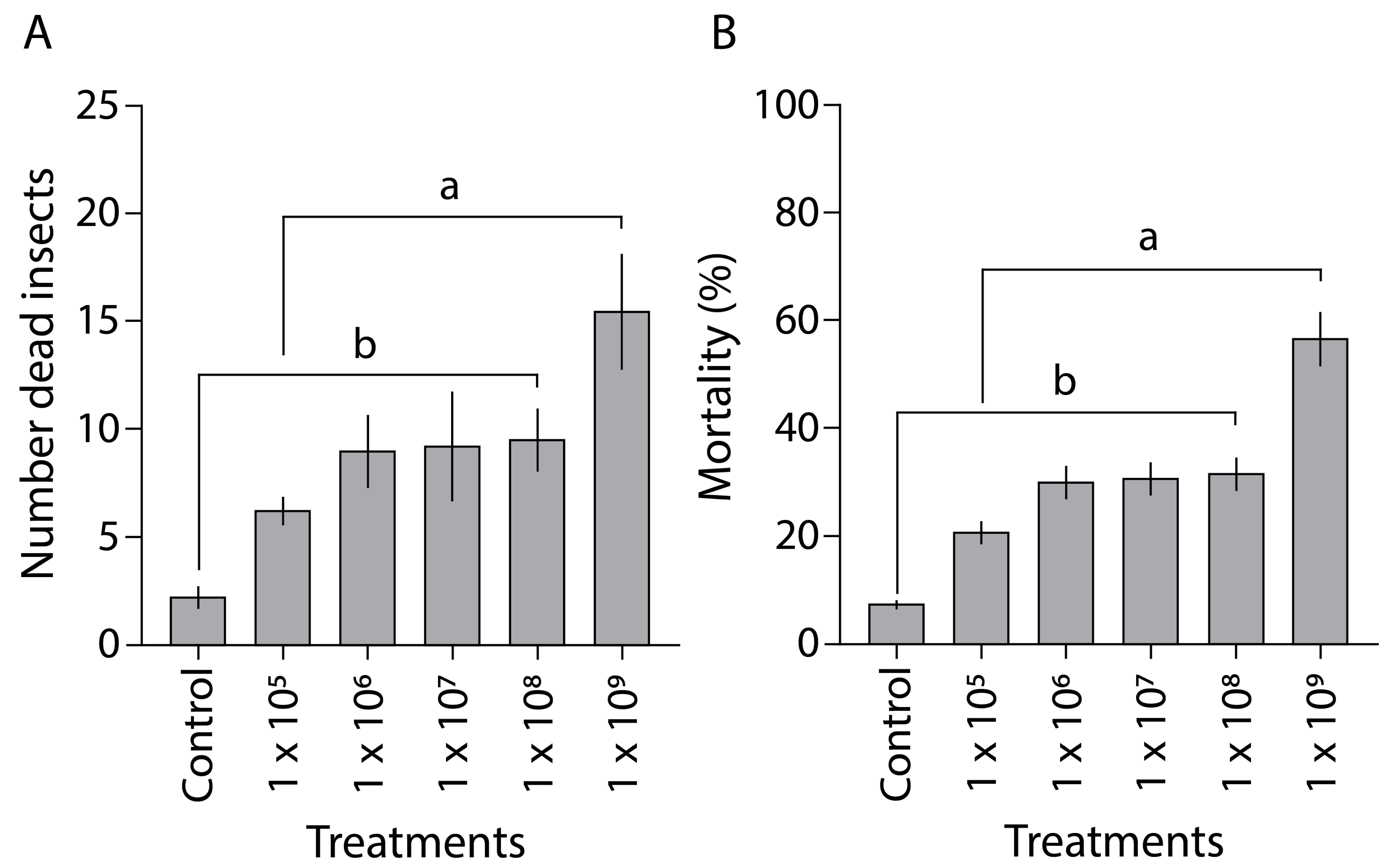 - Dotaona, R.; Wilson, B.A.L.; Stevens, M.M.; Holloway, J.; Ash, G.J. Screening of Tropical Isolates of Metarhizium Anisopliae (Hypocreales: Clavicipitaceae) for Virulence to the Sweet Potato Weevil, Cylas Formicarius (Coleoptera: Brentidae). Int. J. Trop. Insect Sci. 2015, 35, 153–163. [Google Scholar] [CrossRef]
