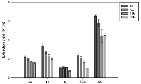 Extraction yield of soluble nutrients (EY, %) related to total Phosphorus (TP) from the five composts (Cw, TT, S, SCB and NG) in the four composting process phases, AT: after thermophilic phase; AC: after cooling; and after a short (15 days, 15 M) or long (80 days, 80 M) maturation period.