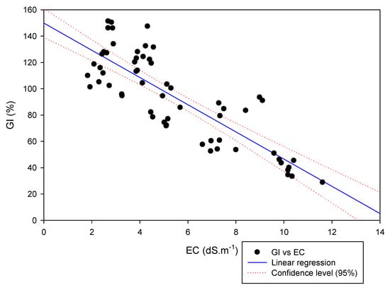 Linear regression line generated with the association of the Germination Index (GI) with the electrical conductivity (EC). The regression equation was GI = −10.3 EC + 149.9, with R2 = 0.70.