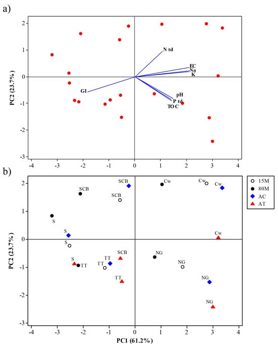 Biplot graphs generated from the PCA with the two principal components (PC1 and PC2). (a) Loading graphs: relationships among the eight chemical, physicochemical, and biological variables used in the PCA. (b) Score plots of the 20 compost teas obtained from the five organic composts (CW, TT, S, SCB, and NG) in the four composting phases: AT (after thermophilic phase), AC (after cooling), 15 M (after a short, 15-day maturation), and 80 M (after a long, 80-day maturation). PC1 primarily represents the gradient of soluble salts (EC, Na, K, NTD) and their negative association with the germination index (GI), while PC2 reflects variations in TOC, PTD, and pH across compost teas.