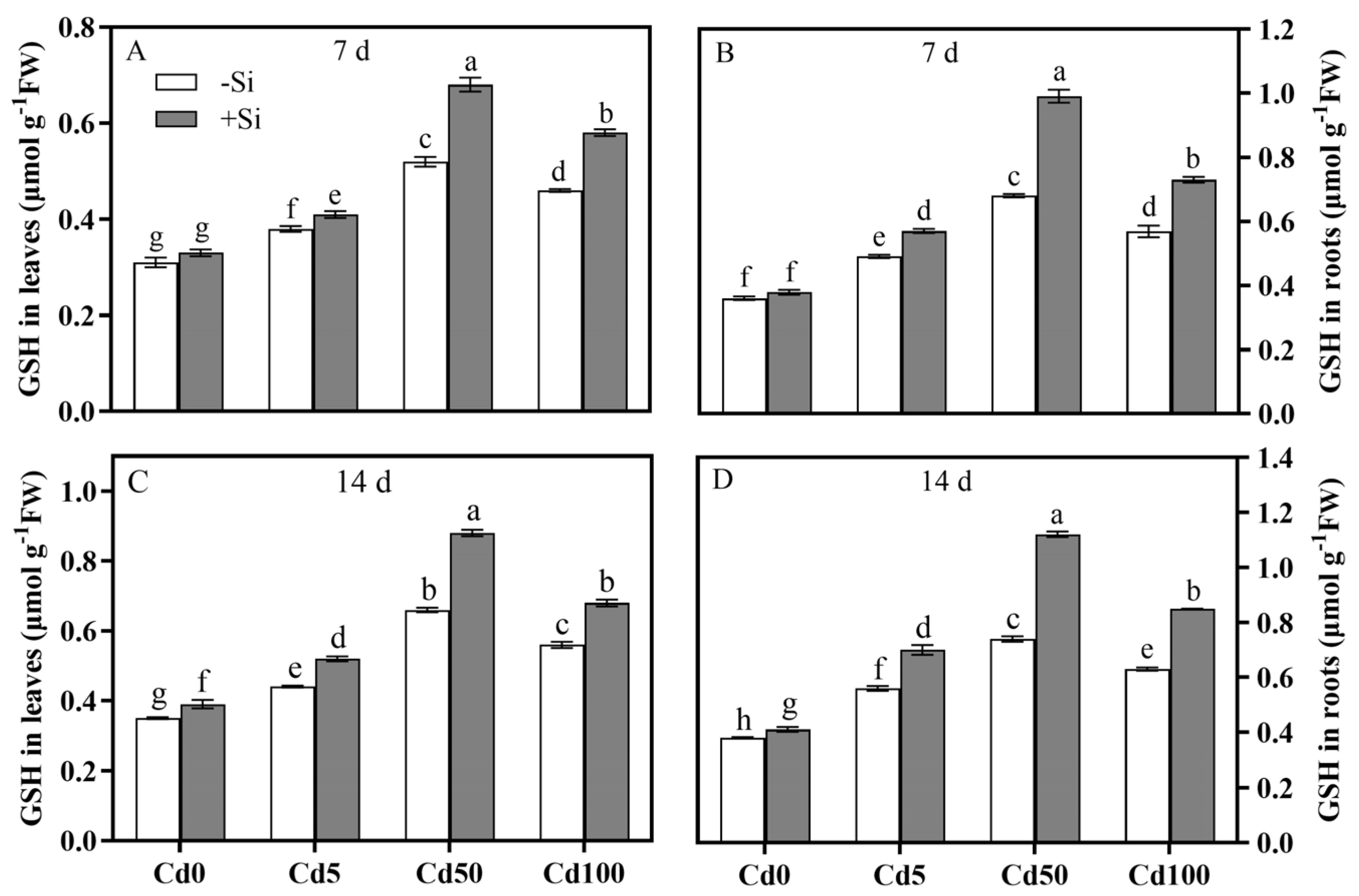 4.3. Effects of Cd and Si on Antioxidant System and Glutathione Metabolism of Rice Plants