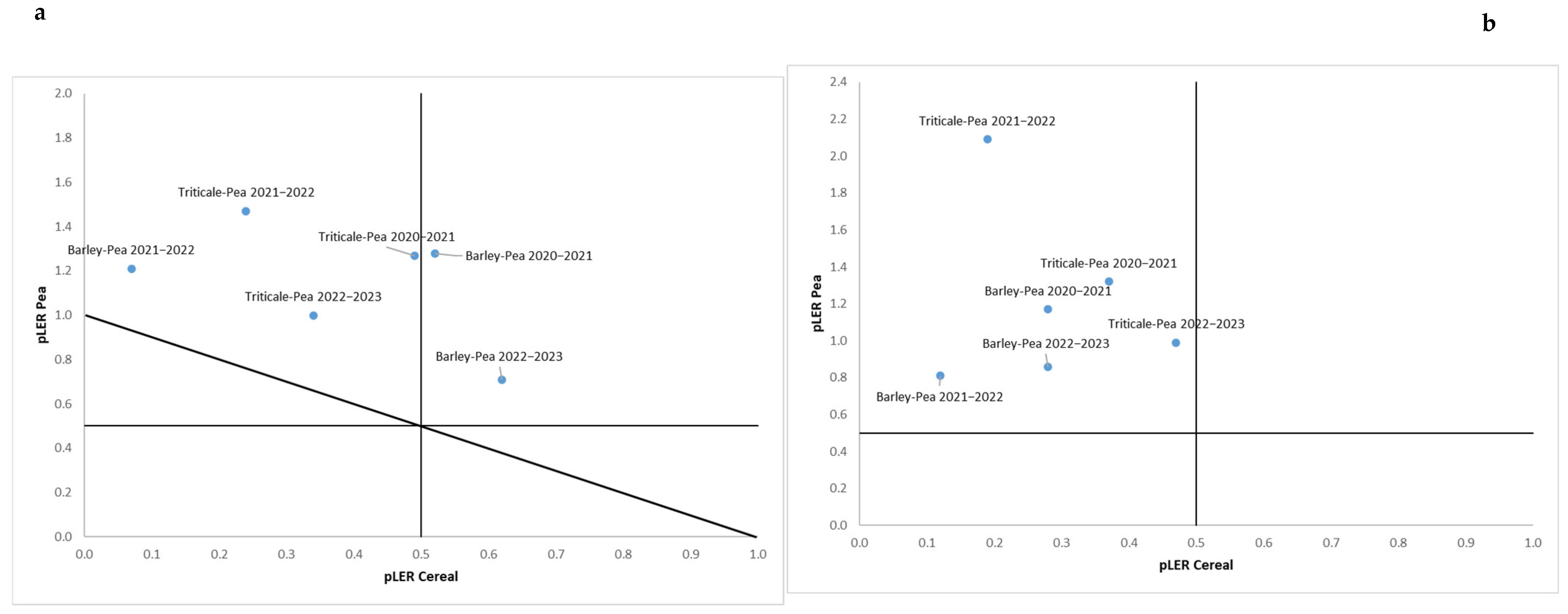 2022–2023 | Barley–Pea | 1.10 a | 4.68 a | −0.04 a | 0.04 a |