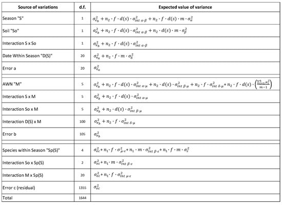 Mixed-effect model of ANOVA where year, soil, dates of the measurements, and species are random-effects factors; while the agroecological weed management is considered as fixed-effect factor. n2 = number (3) of repetitions plus the species within season: 3; s = number of season: 2; f = number of soil: 2; m = number of mulching: 6; n1 = number of repetitions within season and within species: 3 in the first season, and 3–9 in the second season (harmonic mean = 3.66).