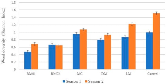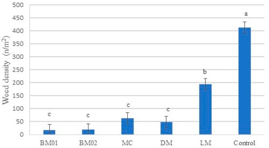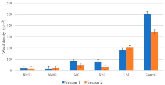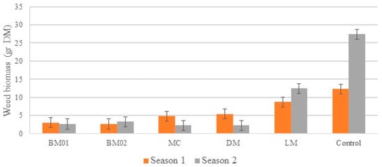 However, analyzing the significant interaction between “Season × AWM” (p = 0.035), as shown in Figure 3, while it is not possible to compare two different seasons statistically, it can be observed that weed density remained unchanged across seasons for BM01, BM02, and LM. In contrast, for MC, DM, and the untreated control, higher weed density values were observed during Season 1 compared to Season 2.