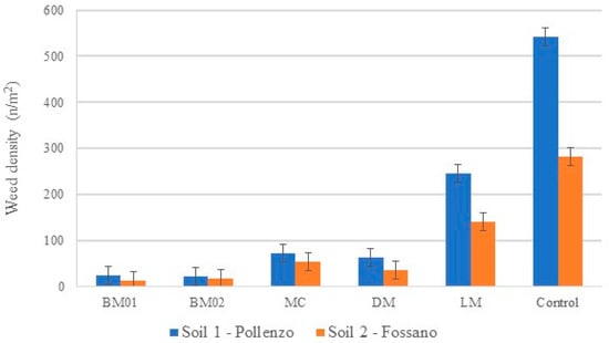 Weed density: interaction between AWM and the two soils (Soil 1—Pollenzo; Soil 2—Fossano). Bars represent mean values ± SE. Blue bars = Soil 1 (Pollenzo); orange bars = Soil 2 (Fossano). BM01 = biodegradable mulch sheet 01; BM02 = biodegradable mulch sheet 02; DM = dead mulch (hazelnut shells); MC = mechanical control; LM = living mulch; Control = untreated control.