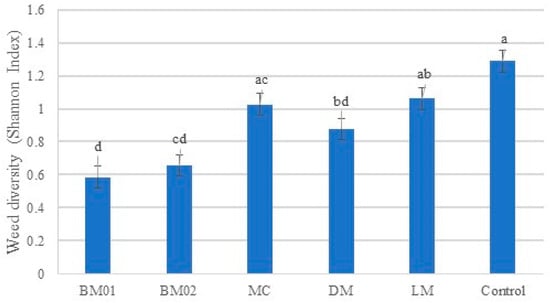 Shannon Index of weeds as a function of AWM. Bars represent mean values ± SE. Different letters above bars indicate significant differences among treatments according to Tukey’s HSD test (p < 0.05). Data are pooled across soils and seasons. BM01 = biodegradable mulch sheet 01; BM02 = biodegradable mulch sheet 02; DM = dead mulch (hazelnut shells); MC = mechanical control; LM = living mulch; Control = untreated control.