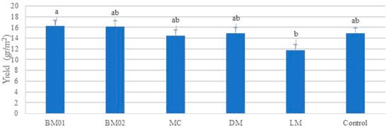 Mean crop yield (average of Lactuca sativa L. var. capitata, Allium cepa L. cv. ‘Tropea’/Allium fistulosum L. and Brasica oleracea L. var. italica) under different AWM practices. Bars represent mean values ± SE. Different letters above bars indicate significant differences among treatments according to Tukey’s HSD test (p < 0.05). Data are pooled across soils and seasons. BM01 = biodegradable mulch sheet 01; BM02 = biodegradable mulch sheet 02; DM = dead mulch (hazelnut shells); MC = mechanical control; LM = living mulch; Control = untreated control.