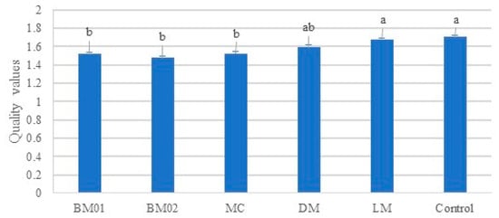Mean harvest quality values averaged across all tested species (Lactuca sativa var. capitata L., Allium cepa L. cv. ‘Tropea’/Allium fistulosum L, and Brasica oleracea L. var. italica) as a function of AWM. Quality values: 0 = extra superior, 1 = good quality, 2 = minimal quality, 3 = unmarketable. Bars represent mean values ± SE. Different letters above bars indicate significant differences among treatments according to Tukey’s HSD test (p < 0.05). Data are pooled across soils and seasons. BM01 = biodegradable mulch sheet 01; BM02 = biodegradable mulch sheet 02; DM = dead mulch (hazelnut shells); MC = mechanical control; LM = living mulch; Control = untreated control.