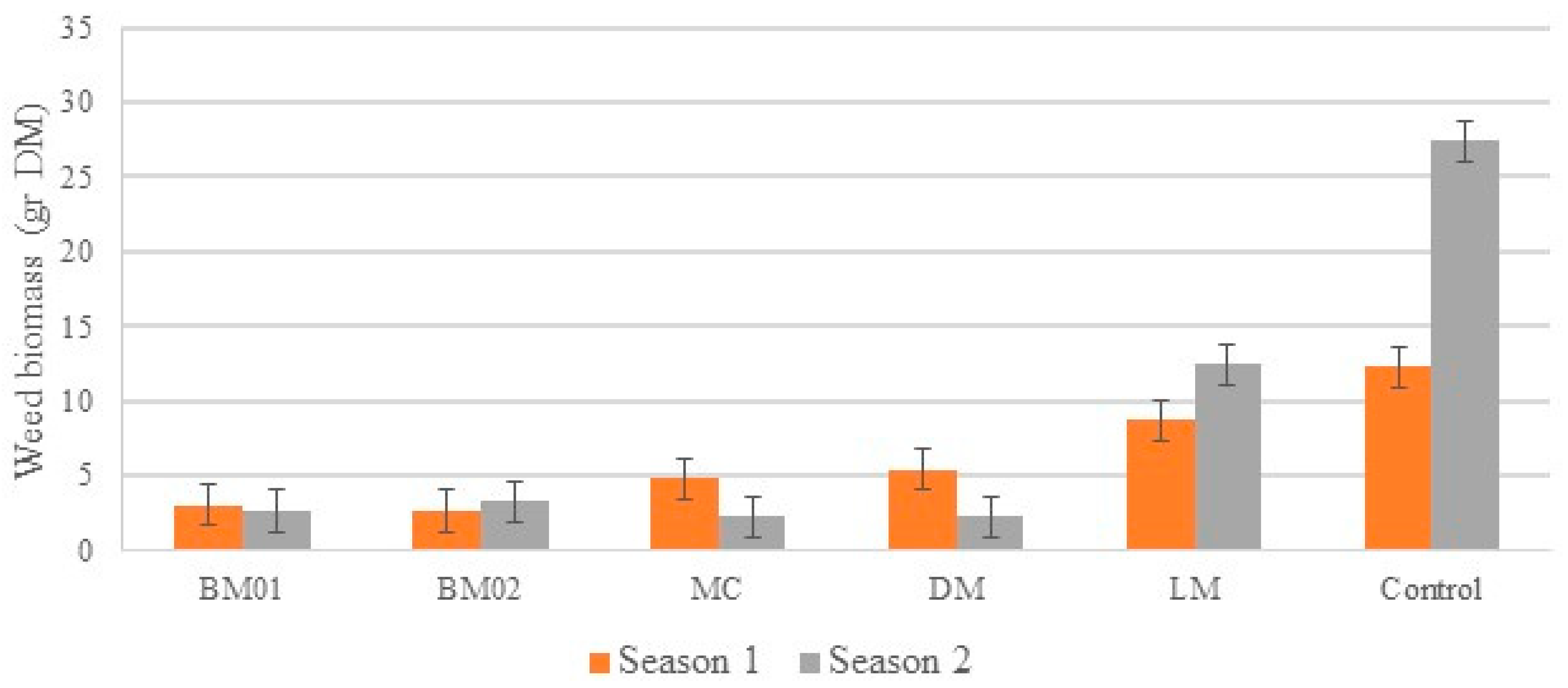In particular, the present research showed that among the analyzed practices, biodegradable mulch sheets were found to result in better weed control in both years. This may be due to their ability to prevent the passage of light, which is essential for photosynthesis and necessary for weed growth, as shown by [