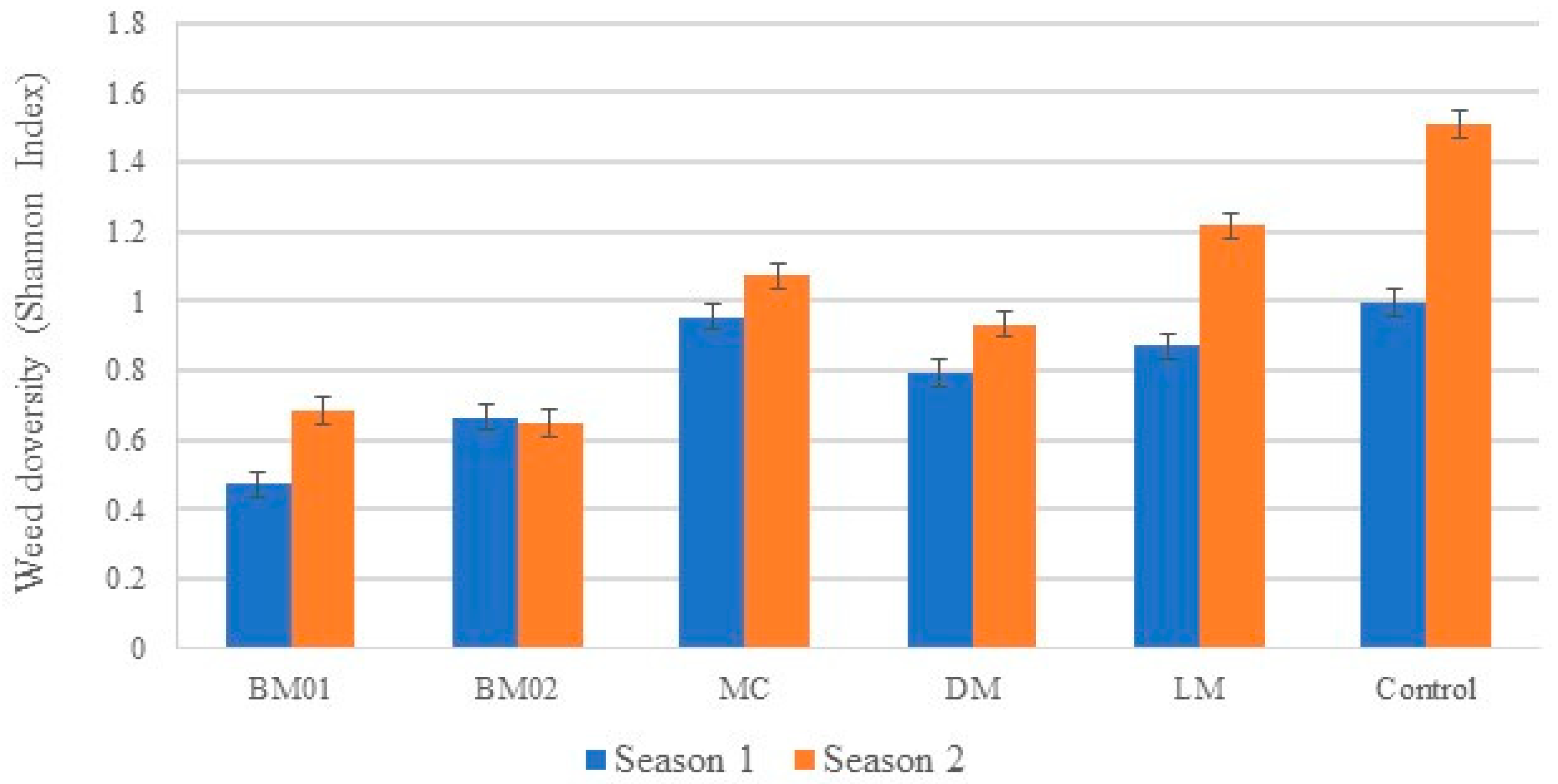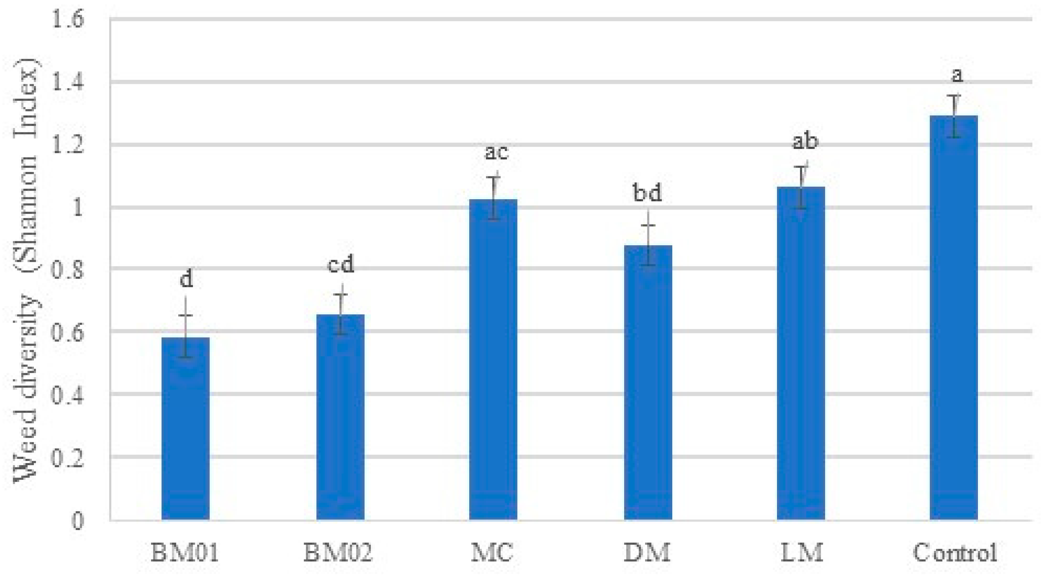 36]. Despite this efficacy against weeds, however, such control of biodegradable sheets has resulted in lower weed diversity compared to other practices.