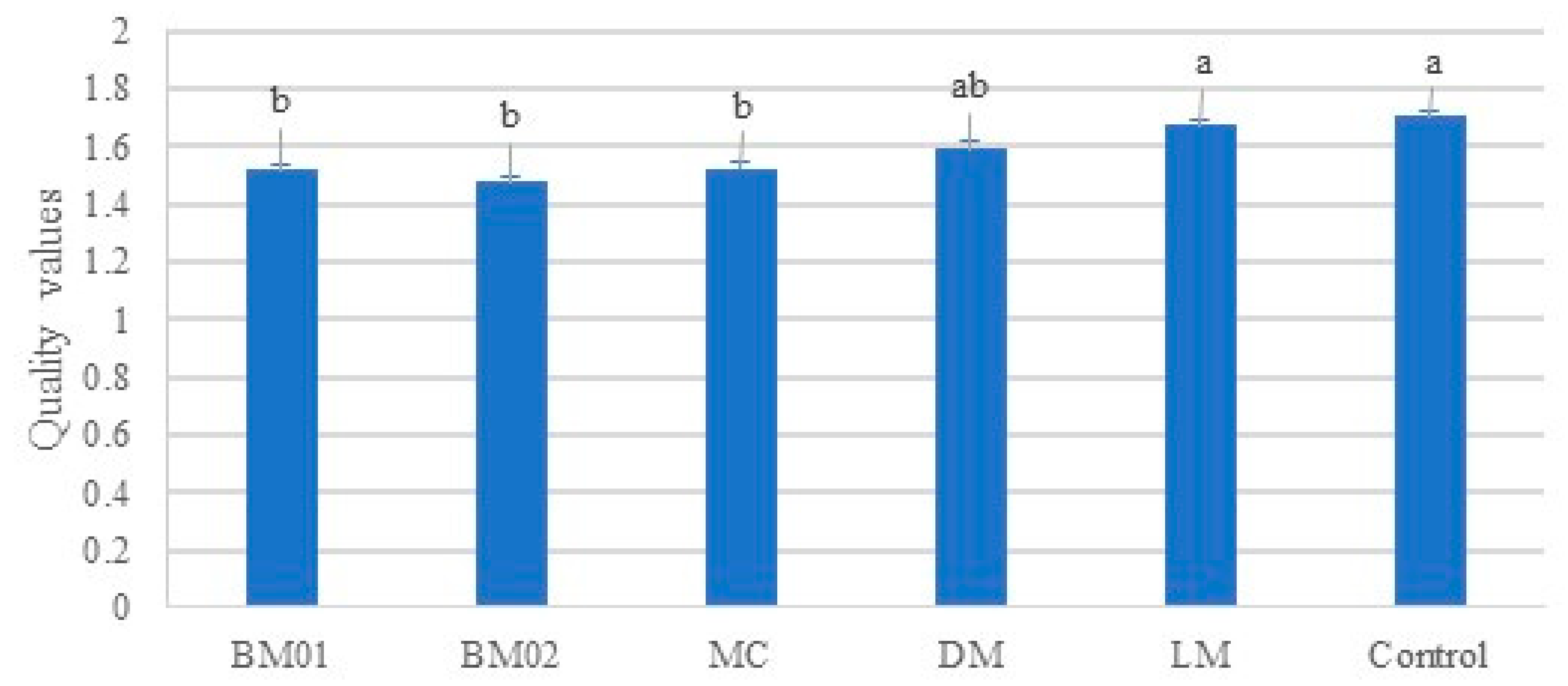 33]. This more efficient weed management could have also contributed to higher yields and quality for all the crops analyzed. This can be attributed to the fact that biodegradable mulch sheets retain water in the soil, reducing evapotranspiration losses. As a result, they contribute to increased aeration and nutrient uptake by the plants [
