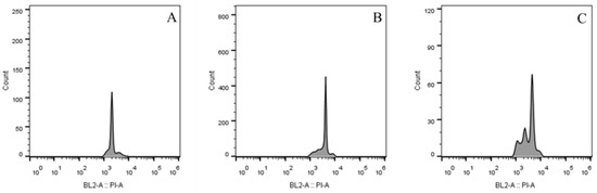 Histogram of flow cytometry analysis. (A) diploid (peak fluorescence at 2000); (B) tetraploid (peak fluorescence at 4000); (C) Diploid-tetraploid mixoploids (exhibiting peaks at both 2000 and 4000 fluorescence values). The x-axis represents the DNA content (PI fluorescence intensity), and the y-axis represents the number of nuclei counted.