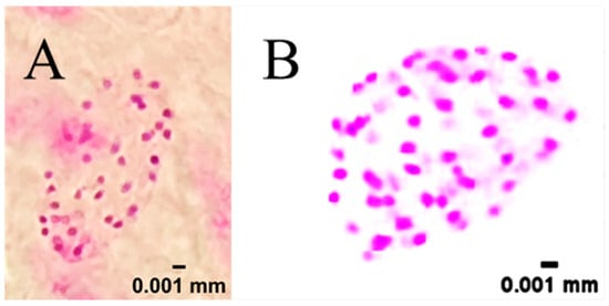 Chromosome count in root-tip metaphase cells. (A) Diploid control kenaf, showing 36 chromosomes (2n = 2x = 36); (B) Induced tetraploid kenaf, showing 72 chromosomes (2n = 4x = 72).