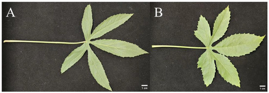 Leaf morphology of diploid (A) and tetraploid (B) kenaf plants, showing differences in size and coloration. Bar = 1 cm.